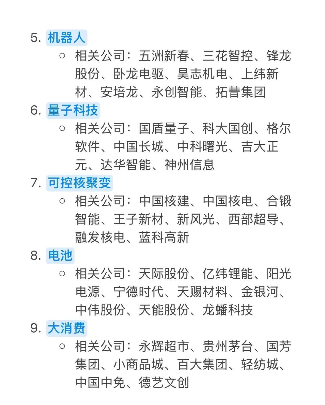 2026年值得关注的10大核心方向及相关公司如下: 1. 半导体:涉及北方华创、中芯国际、瑞芯微、闻泰科技、华虹公司、长电科技、沪硅产业、华特气体、彤程新材等企业。 2. 算力:相关公司有寒武纪、海光信息、新易盛、中际旭创、工业富联、统一股份、英维克、澜起科技、芯原股份、科华数据。 3. AI应用:包含蓝色光标、省广集团、南兴股份、道通科技、科大讯飞、昆仑万维、易点天下、值得买、汉得信息、中文在线等。 4. 端侧AI:有博通集成、乐鑫科技、兆易创新、佰维存储、水晶光电、蓝思科技、明月镜片、博士眼镜等企业。 5. 机器人:涉及五洲新春、三花智控、锋龙股份、卧龙电驱、昊志机电、上纬新材、安培龙、永创智能、拓普集团。 6. 量子科技:相关公司有国盾量子、科大国创、格尔软件、中国长城、中科曙光、吉大正元、达华智能、神州信息。 7. 可控核聚变:包含中国核建、中国核电、合锻智能、王子新材、新风光、西部超导、融发核电、蓝科高新等。 8. 电池:涉及天际股份、亿纬锂能、阳光电源、宁德时代、天赐材料、金银河、中伟股份、天能股份、龙蟠科技。 9. 大消费:相关公司有永辉超市、贵州茅台、国芳集团、小商品城、百大集团、轻纺城、中国中免、德艺文创。