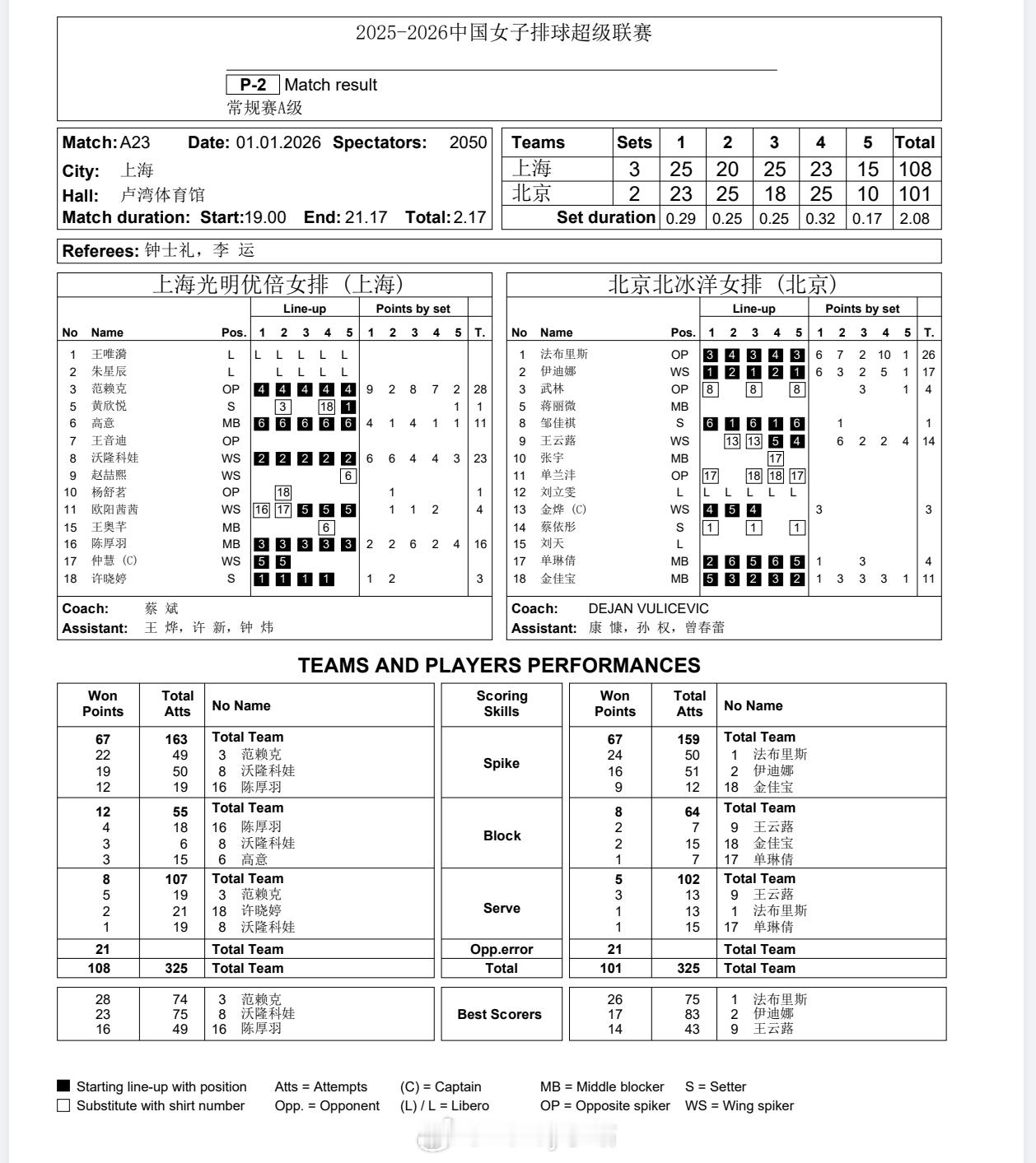 【技术统计】排超联赛第6轮,上海女排3比2北京女排(25-23 20-25 25-18 23-25 15-10)排超联赛2025-2026中国排球超级联赛