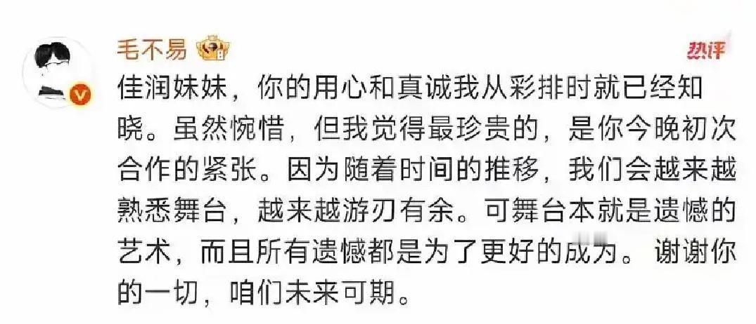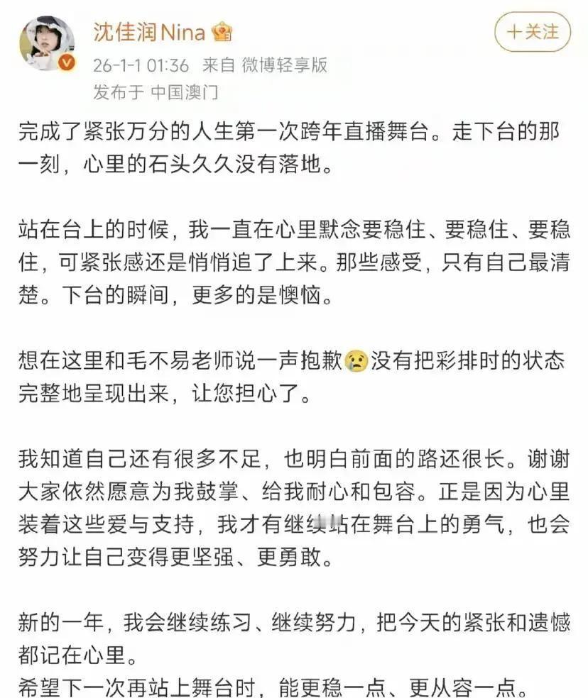 沈佳润跨年夜和毛不易合唱《平凡的一天》直接唱劈叉,高音区像踩空楼梯,节拍也提前半拍,镜头扫到她手抖到话筒快掉。 小姑娘凌晨发长文道歉,说太想做好反而脑子空白,把失误全揽自己身上。 毛不易没甩锅,只回了一句站上舞台的人都值得鼓掌,顺手把热搜火力减半。 我看直播时也跟着捏汗,可回头想想,谁第一次上台不腿软? 新人被一把推上万人直播,没躲没逃,唱砸了还先道歉,这份勇气比完美更真实。 失误不可怕,怕的是没人再给你下一次灯牌。 她敢回来,我就敢再听。
