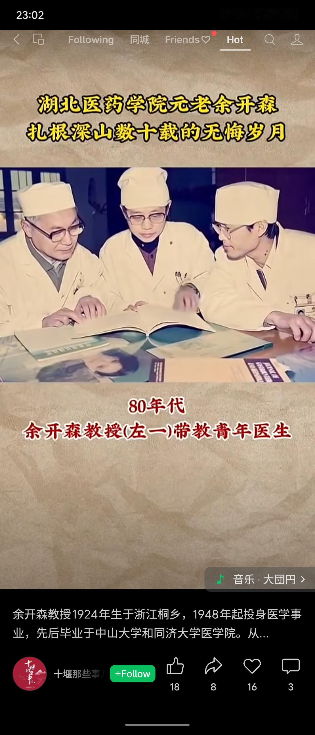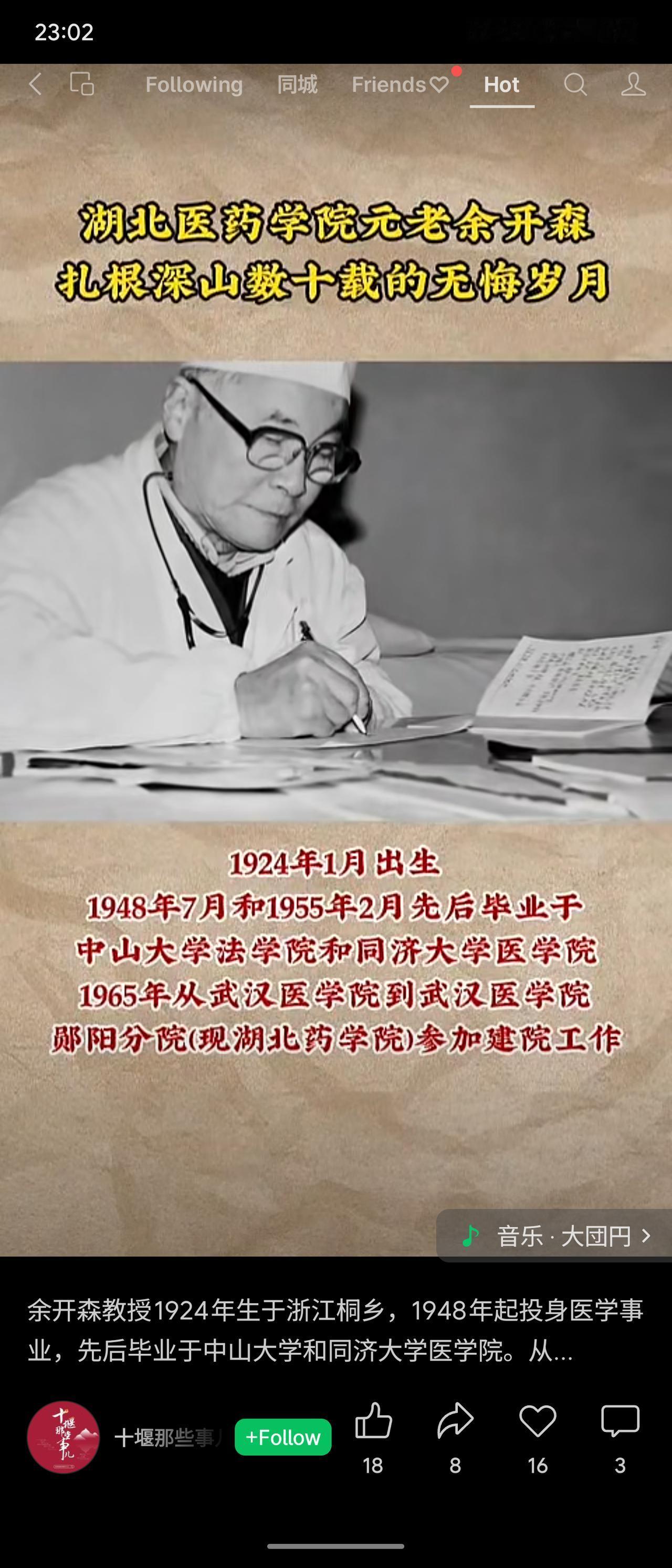 余开森(1924-),毕业于中山大学、同济医学院。1965年赴湖北郧阳参与建院,扎根山区数十载。80年代悉心带教青年医生,90年代推动科研成果鉴定,毕生奉献于医学教育与研究。