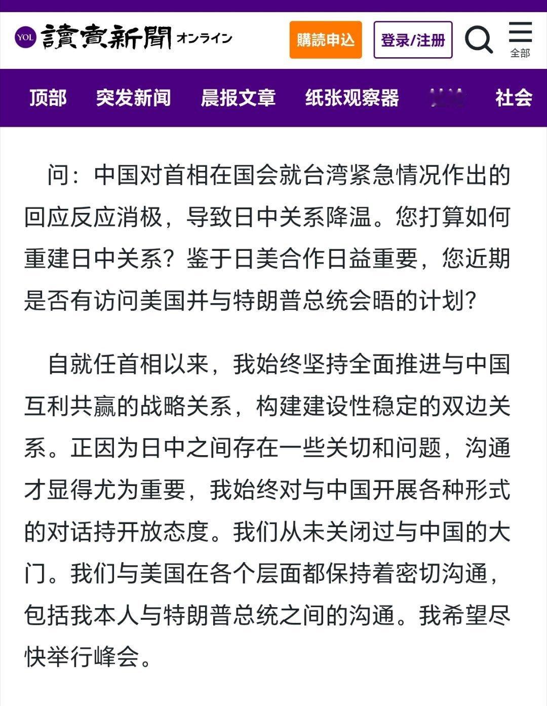 高市早苗在接受日本《读卖新闻》采访,回应中日关系,重复之前的老调。
