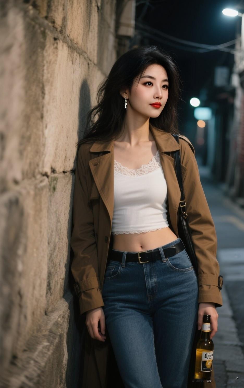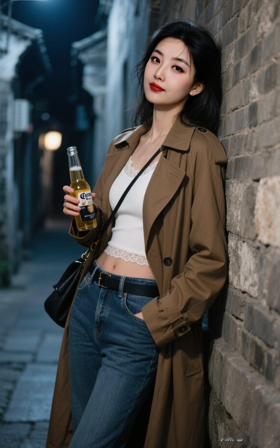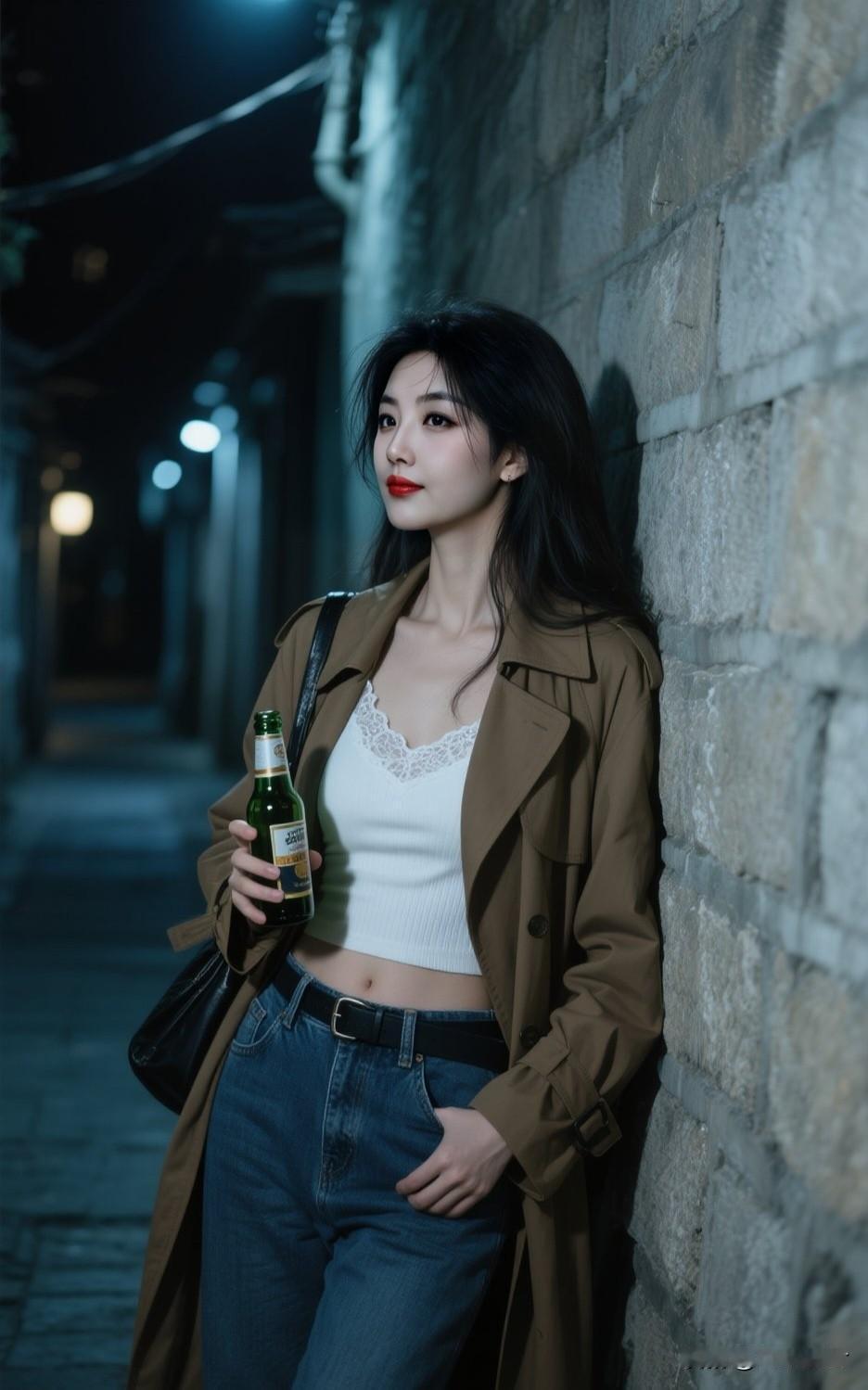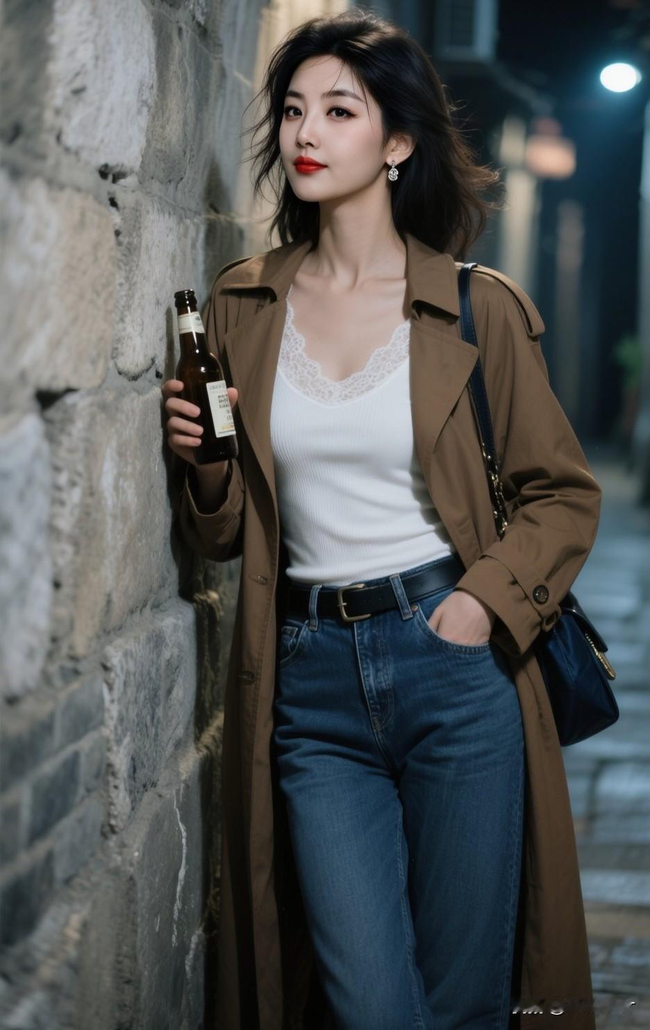夜晚的街头,手持啤酒,时尚穿搭,自由自在。