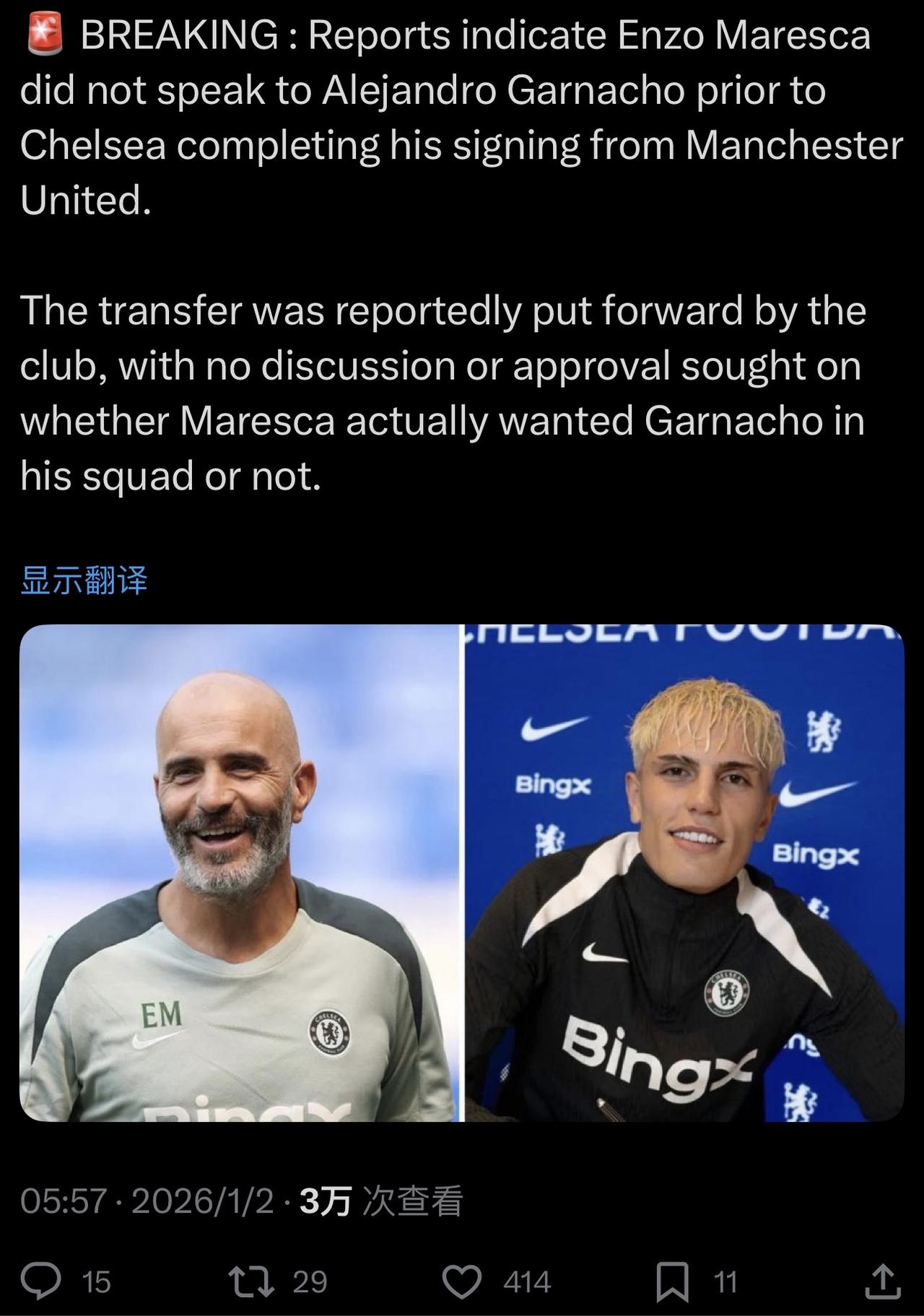 加纳乔:主教练杀手[憨笑][憨笑][憨笑] 我当初很好奇,车子到底谁决定买这哥们的,球探没给分析报告吗? ……………………………………………………………… 有报道称,在切尔西完成从曼联签下亚历杭德罗·加纳乔之前,恩佐·马雷斯卡并没有与他交谈。 据报道,这笔转会是由俱乐部提出的,并没有就马雷斯卡是否真的想让加纳乔加入他的球队进行讨论或征求他的同意。