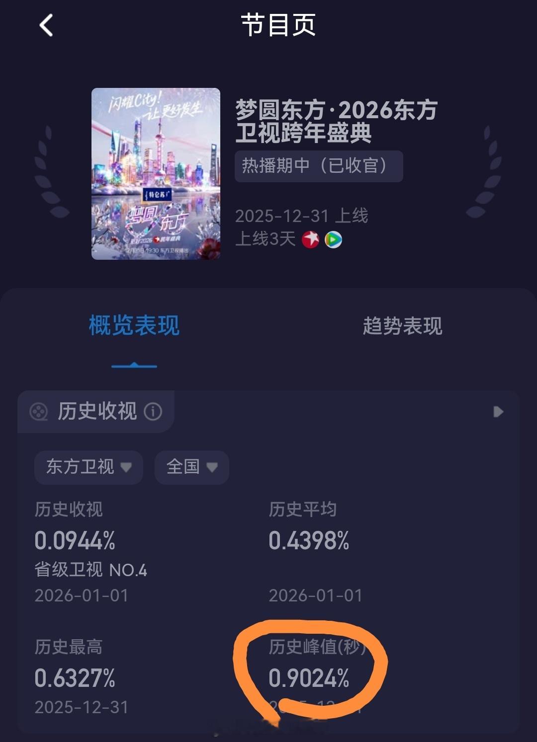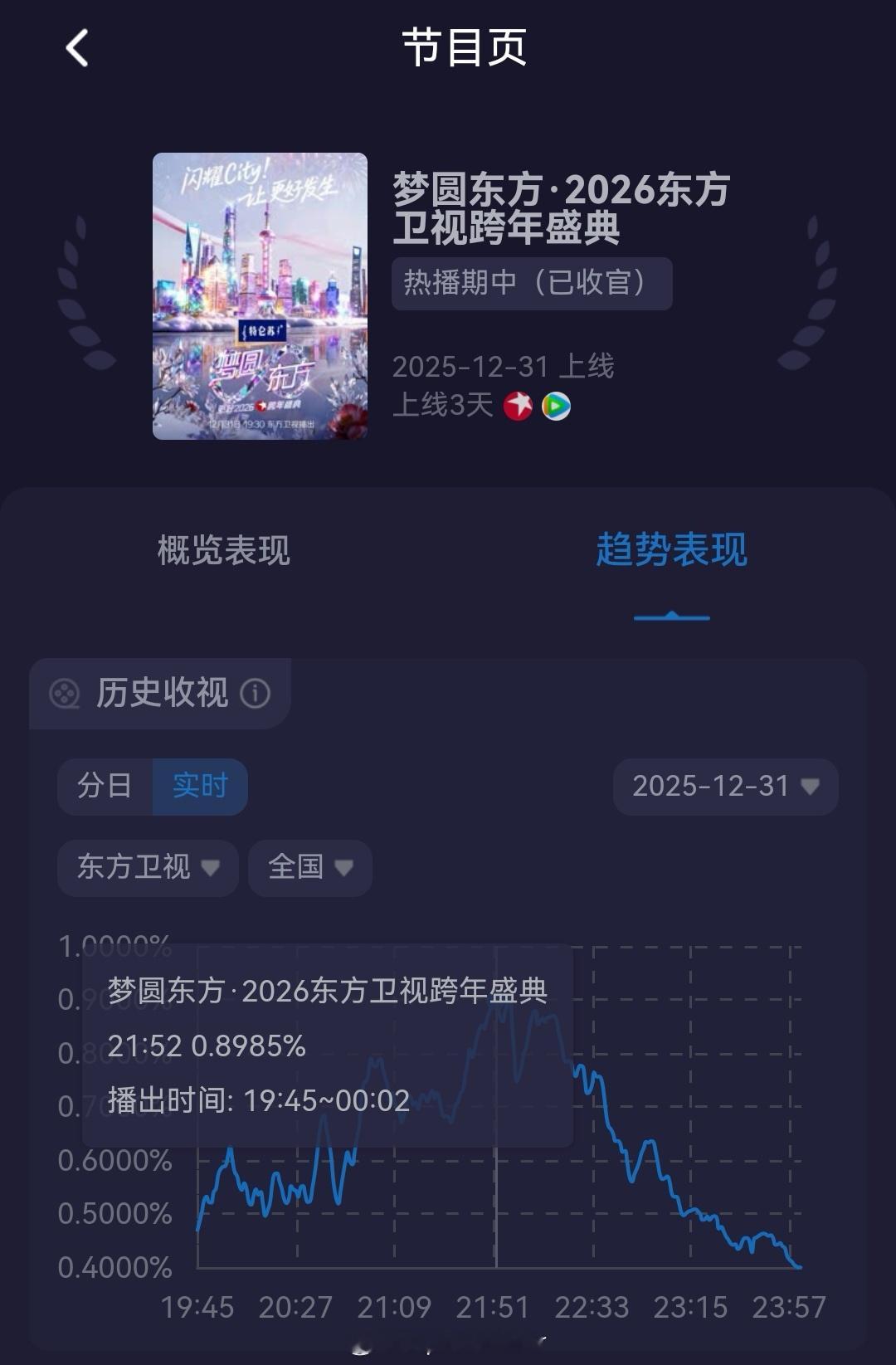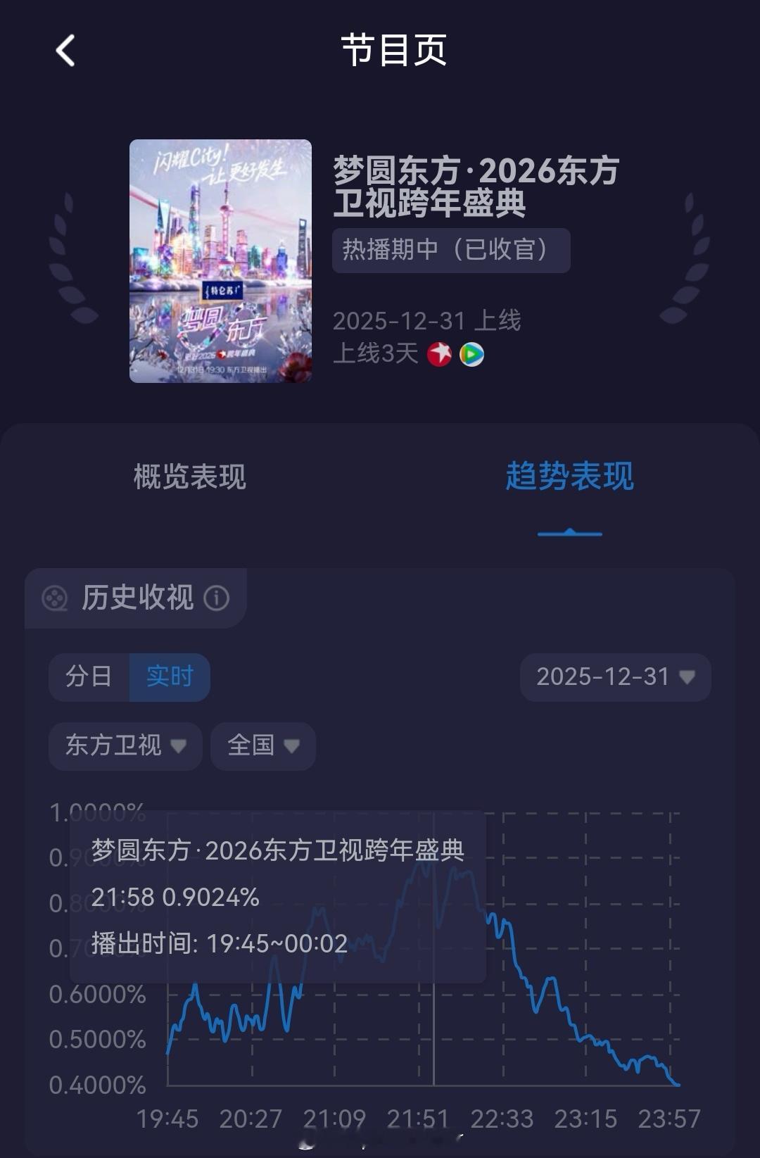 毫无疑问,2026东方卫视跨年收视最高峰,落在肖战21:58的采访,冲到0.9024,整晚收视最高。果然真的是太厉害了,今年东方请肖战请对了。另外前面6分钟的小高峰,也刚好是肖战的表演。所以如果给肖战在黄金时段的表演时长拉长,你茄不得直接实时收视破1?