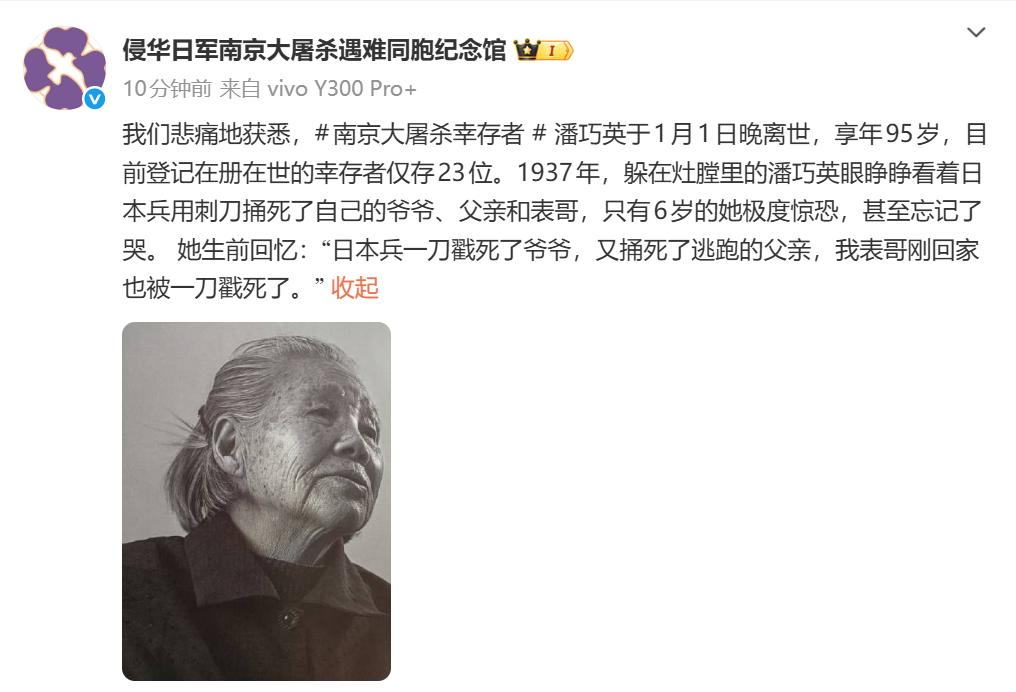1月2日,侵华日军南京大屠杀遇难同胞纪念馆发布消息:南京大屠杀幸存者潘巧英老人于1月1日晚去世,享年95岁。 1937年,南京沦陷时,潘巧英只有6岁。她躲在家里的灶膛中,眼睁睁看着日本兵用刺刀杀害了她的爷爷、父亲和表哥。极度的恐惧让她当时连哭都哭不出来。晚年回忆起那一幕,她仍清晰记得:“日本兵一刀刺死了爷爷,父亲逃跑时也被捅死,刚回家的表哥同样没能逃过……” 随着潘奶奶的离去,目前登记在册的南京大屠杀在世幸存者仅剩23位。 每一位逝去的幸存者,都是一段鲜活历史的见证。愿逝者安息,真相永存。