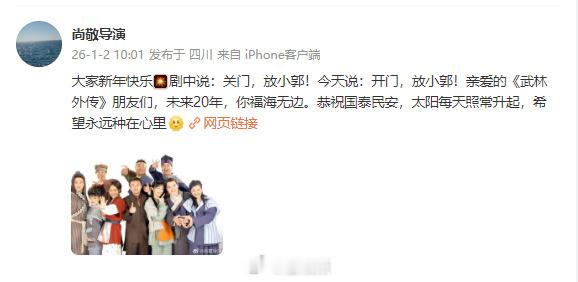 【武林外传导演回应郭芙蓉自由了】1月2日是《武林外传》开播20周年,也是郭芙蓉打工还债20年重获自由之日,发文:剧中说:关门,放小郭!今天说:开门,放小郭!亲爱的《武林外传》朋友们,未来20年,你福海无边。