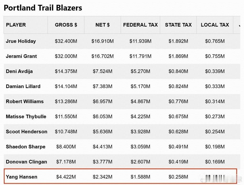杨瀚森杨瀚森nba 杨瀚森新秀赛季工资:交税208万美元,税后工资234.2万美元。近日,美国体育媒体HoopsHype对NBA本赛季所有球员的税后工资进行了统计。杨瀚森在2025年NBA选秀大会首轮第16顺位被选中,与开拓者签下一份4年2139万美元的新秀合同,4年的薪资分别为442万美元、464万美元、486万美元、746万美元,其中,最后两年为球队选项,球队可以选择执行合同或不执行合同。2025-26赛季为杨瀚森的新秀赛季,本赛季合同薪资为442.236万美元,据统计,杨瀚森需要交158.8万的美国联邦政府税、25.8万的州税、10.4万的地方政府税、1.7万的运动员税及个人养老保险扣除等,最终到手工资约为234.2万美元。
