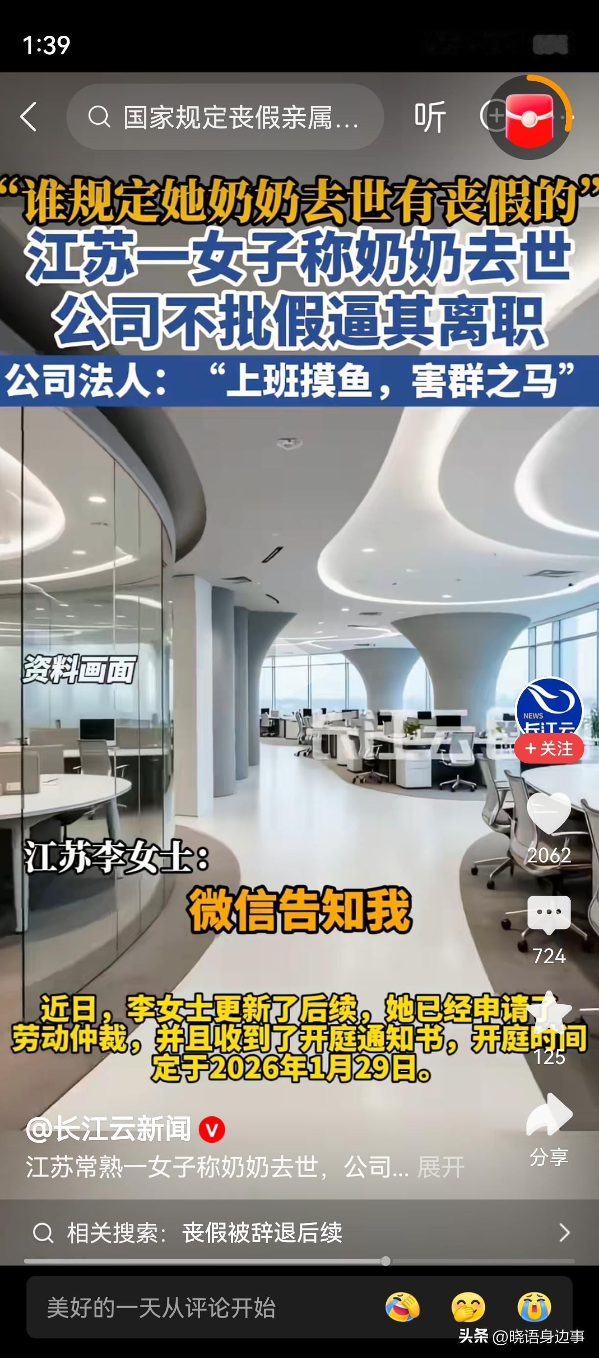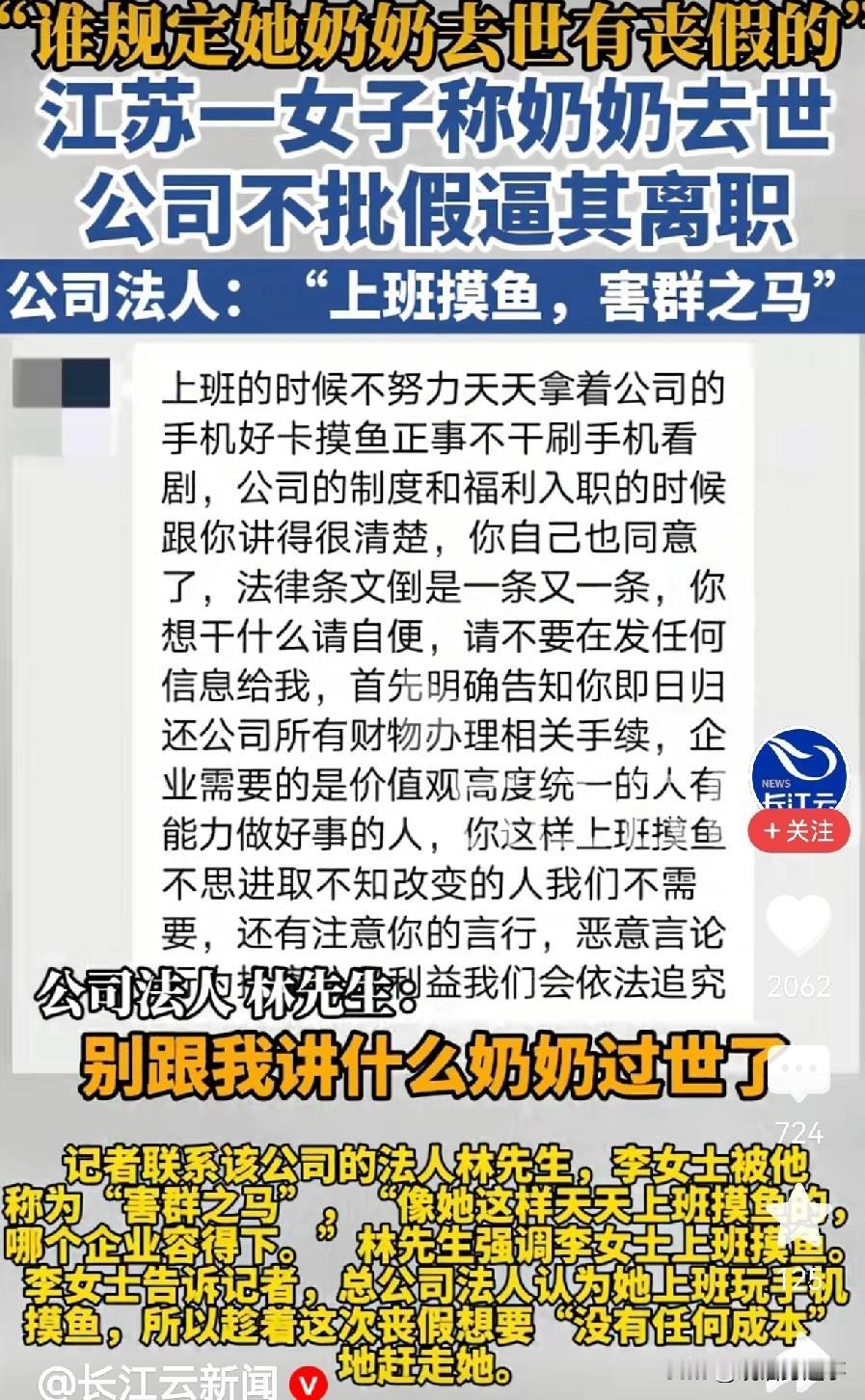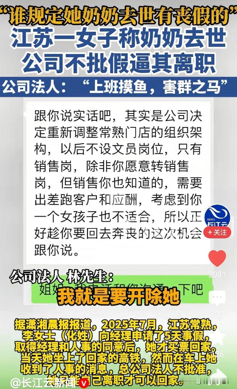 “谁规定奶奶去世一定就有丧假的”,“你要去可以,回来就办离职吧”。近日一女子称奶奶去世,公司逼她离职,还说她是害群之马。 2025年的7月,江苏常熟一职员向人事部请5天丧假,取得同意后她便坐上了回老家的高铁,可没想到还没到家呢,就在车上就收到公司法人不批准的消息,称但凡离开公司岗位就办离职。 女子想不明白,干得好好的,不过就是请个假为什么公司这么反感,还要开除她,在人事部那里她了解到,原来公司早就不想继续留下她所在的岗位,女孩是个文员,打点资料做做后勤,公司要的是能销售的人员,对公司有一定盈利的职位。 随后女子联系到记者诉说了自己的遭遇,记者也和公司法人沟通,问到为什么对职员请假就离岗的要求,法人直接说,早就不满意这个职员的工作态度,不思进取,上班摸鱼玩手机,害群之马。 近日,该女子已经申请了劳动仲裁,于1月底开庭。