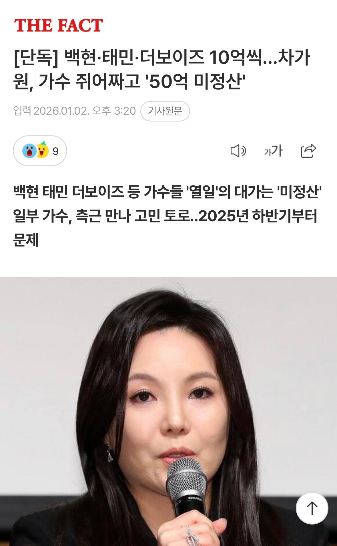 伯贤·泰民·THE BOYZ各被One Hundred拖欠10亿韩元工资…车佳元压榨歌手“50亿未清算” 据《The Fact》的采访结果显示,One Hundreds所属的男团The Boyz目前需要结算的金额达到10亿韩元。旗下唱片公司INB100所属歌手伯贤的未结算金额也是10亿韩元左右,CHEN和XIUMIN也应该各自再收到上亿的金额。另一个旗下唱片公司Big Planet Made所属的泰民的未结算金也远远超过了10亿。 泰民于2024年4月加入Big Planet Made,8月开始世界巡回演唱会,到2025年4月为止周游了全球29个地区。虽然结算可能因合同而异,但考虑到一般是在3个月后,可以推测从当时演出的收益开始就没有收到部分结算。同时,从去年9月持续到年末的日本竞技场巡演也未结算。 伯贤设立后CHEN和XIUMIN加入的INB100在2024年5月被One Hundred收购。伯贤之后马上进行了世界巡回演唱会,去年6月从首尔开始,在全世界28个城市举办了演唱会。2号到4号还将在首尔KSPO巨蛋举办安可演唱会。虽然一直在“努力工作”,但从2025年下半年开始,就没有收到应得的工资。 CHEN、XIUMIN、The Boyz等其他歌手的情况也都差不多。车佳元代表利用歌手的IP获得巨额预付款后,歌手们一直在“努力工作”,但2024年仅服装费就花费了约108亿韩元(车佳元方面解释称是制作费误写成了服装费),由于此类非正常支出让余额被用尽,所以看起来并无改善的余地。