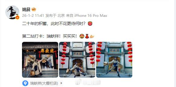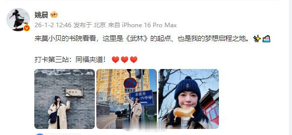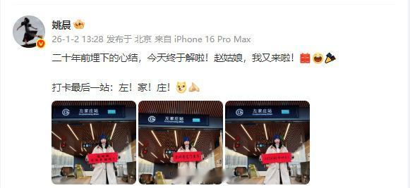 【姚晨晒照打卡四站庆祝郭芙蓉自由了】2026年1月2日,《武林外传》开播已满二十周年了。“恭喜郭芙蓉”“郭芙蓉今天正式还清债务”等多个话题登上热搜。晒照发文庆祝“小郭重获自由的第一天”,半天一共打卡了四个站:第一站打卡:六里桥!第二站打卡:瑞蚨祥!买买买!二十年的积蓄,此时不花更待何时?第三站:同福夹道!来莫小贝的书院看看,这里是《武林》的起点、也是我的梦想启程之地。最后一站:左家庄!二十年前埋下的心结,今天终于解啦!赵姑娘,我又来啦!