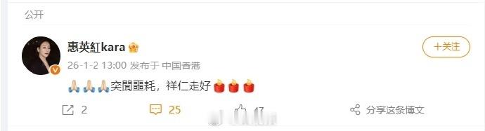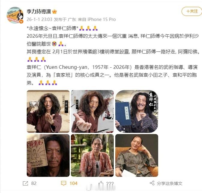 【甄子丹发文悼念袁祥仁】1月2日,发文:当年笑太极的青涩初遇,到近年乔峰传的江湖别作。祥仁哥功在光影,风骨长存,我们永远怀念您。🙏一路走好 发文 : 突聞噩耗,祥仁走好 1月1日,发文:2026年元旦日,袁祥仁师傅的太太传来一个沉重 消息, 祥仁师傅今午因病于伊利沙伯医院离世。其丧礼定在 2月1日于世界殡仪馆3楼明德堂设灵, 愿祥仁师傅一路好走, 阿弥陀佛。袁祥仁(Yuen Cheung-yan,1957年-2026年)是香港著名的武术指导、导演及演员,为「袁家班」的核心成员之一。他是著名武指袁小田之子、袁和平的胞弟。袁祥仁去世