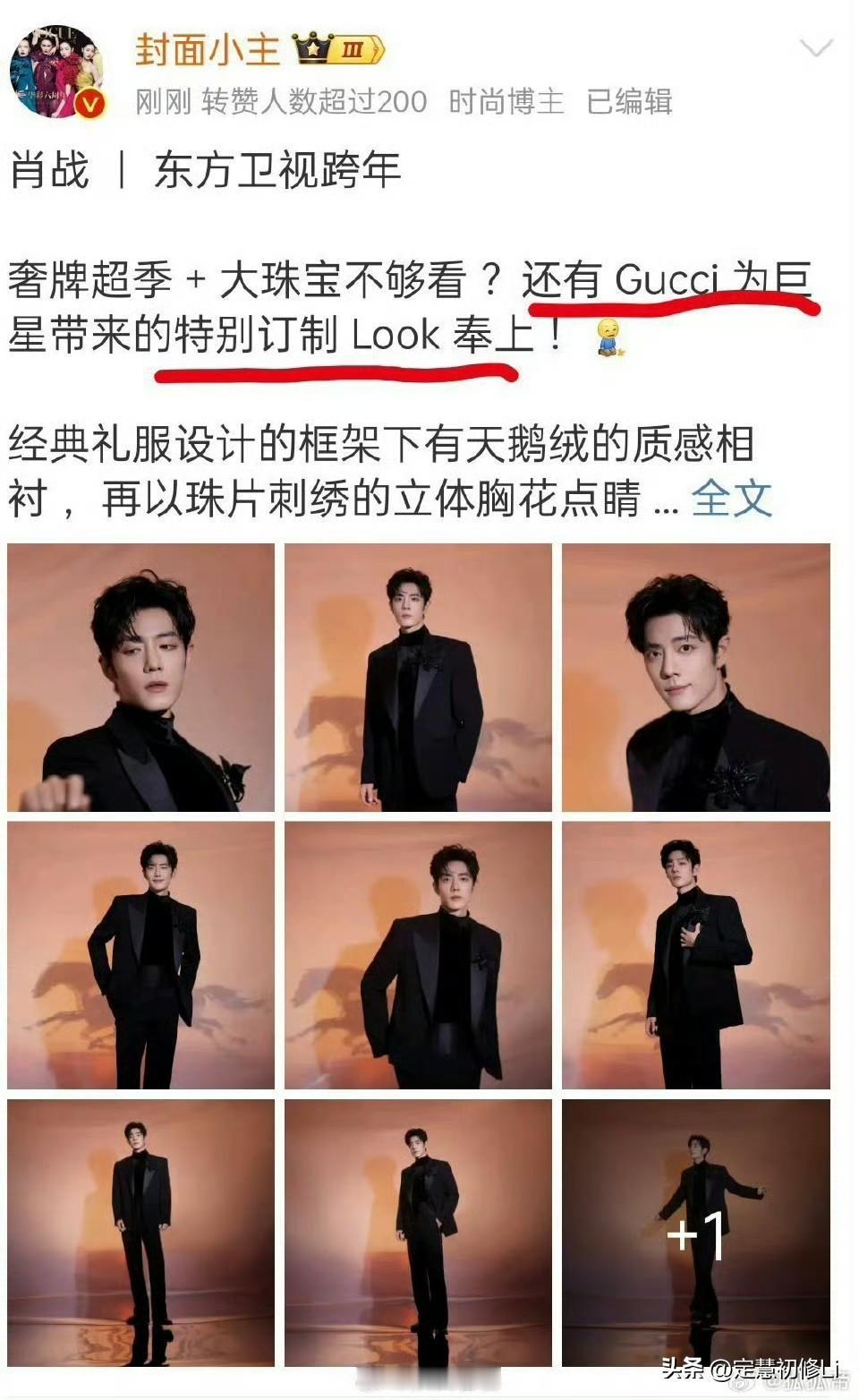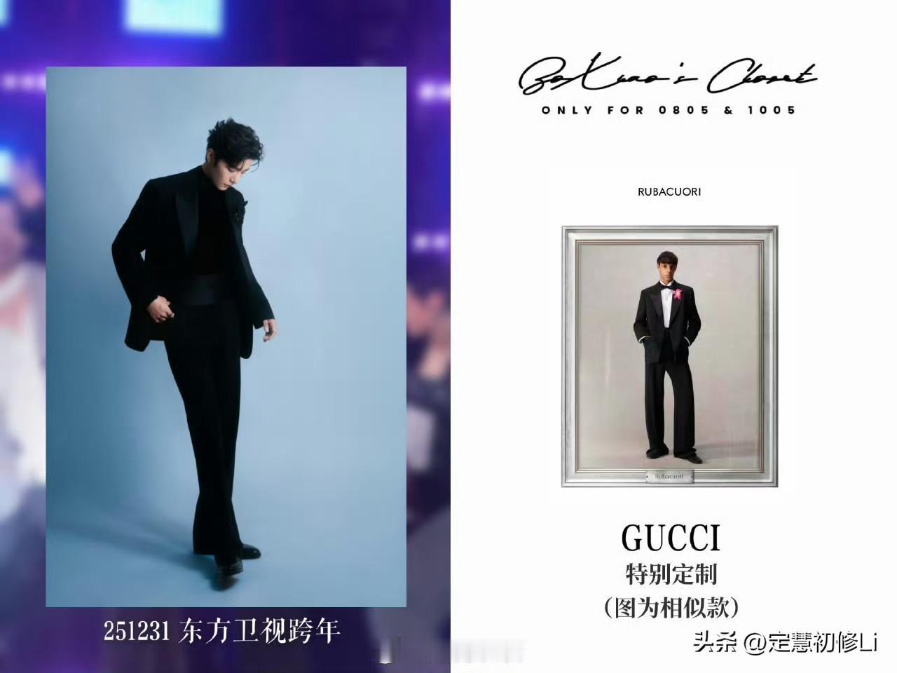肖战东方卫视跨年演唱会穿的黑色礼服套装,是Gucci为肖战晚会演出表演的专属定制,全球仅此一套[赞]模仿的copy的高仿同款的的挂件请远离,穿低配仿制的穿就穿了,出来丢人现眼嚷嚷的就不合适了