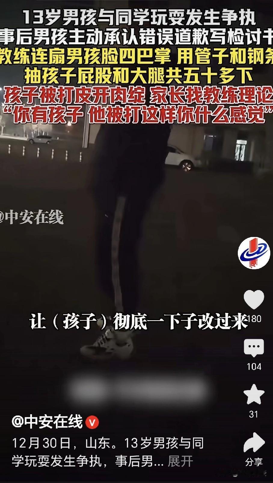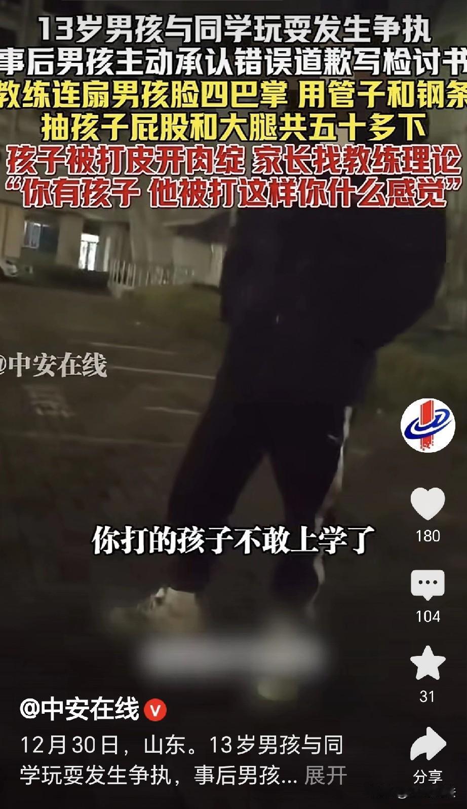 这不叫体罚,这是往死里打呀!山东,一13岁男孩和同学玩纸牌,俩人发生矛盾,互相打了一架,打完之后,男孩给同学道歉,拿着检讨书去找教练,教练不分青红皂白,直接扇男孩4个耳光,罚蹲3个小时,之后,教练还不解恨,又拿PVC管子打男孩20多下,打完之后,他换成钢制的箭条,抽打男孩30多下,男孩皮开肉绽,教练还不算完,他放出话来: 这只是开始,明天继续!男孩父亲找教练理论: 你马上就有孩子,他被打成这样你啥感觉? 父亲送孩子学习射箭,可到了很晚,还不见孩子回来。 父亲急了,急忙去接孩子,谁知道孩子被教练打的皮开肉绽,走路艰难。 父亲被吓了一跳,自己和教练无冤无仇,孩子也只有13岁的年龄,到底是发生了什么,咋能把孩子打成这样! 原来,父亲送男孩去学习射箭,空闲时间,男孩和同学一起玩纸牌。 谁知玩了一会,男孩和同学发生了矛盾,俩人拌嘴,就吵了起来。 男孩们十分的调皮,吵着吵着,就开始动手,俩人打了一架,然后谁不理谁。 可过了一会,男孩绷不住了,他主动跑去和同学道歉。 他承认错误,不该因为玩纸牌就和同学生气打架,为了表示真诚,男孩主动写了一份检讨书。 孩子们幼稚,天真可爱,他们认为,这件事应该告诉教练。 男孩立刻行动,拿着检讨书就去找了教练,教练得知了情况,立刻把男孩训斥了一顿。 教练训完孩子,又觉得不能就这么算了,他挥起巴掌,往孩子脸上连扇了4下。 孩子被打的满脸通红,可孩子害怕,忍着不敢吭声,教练打完,不让男孩前去训练。 他让男孩蹲在地上,不许起来,男孩依照教练的吩咐,整整在地上蹲了3个小时。 在这期间,教练去给别的孩子训练,训练结束,教练又把孩子们叫到一起,说要开会。 男孩站在一边,吓得瑟瑟发抖,他不明白,自己和同学打架,主动的道歉,还写了检讨书要教练看。 难道这样做不对吗?男孩手足无措,看着教练他就害怕。 果不其然,教练还不解恨,在他心里,男孩这是犯了天大的错误! 他叫来两个大点的孩子,要一个孩子摁着男孩的手,另一个孩子摁着男孩的脚。 然后,他叫俩人把男孩摁在一个桶上,他拿一根PVC 的管子,朝男孩P股大腿上狠狠打去。 他使劲了力气,一口气抽打男孩20多下,男孩哭叫,可是教练依旧不肯停下。 教练打完之后,他又觉得PVC管打的太轻,他不解气,又拿起一根钢制的箭条,往男孩身上不停的抽去。 他咬牙切齿,一口气打了男孩30多下,男孩P 股 大 腿,已经被打的皮开肉绽。 男孩哭的嗓子都已经哑了,他不知道自己究竟做错了什么。 即便是和同学打架,但也罪不至死,教练这样抽打自己,男孩越想越觉得委屈。 教练打完之后,他把箭条扔到了一旁,他擦了擦自己的汗,他告诉男孩,开始就没结束!明天继续! 男孩绝望,这是犯了天大的罪吗?他一瘸一拐,艰难的往家里赶去。 父亲不见孩子回来,急的一路找来,发现孩子被打成了这样,父亲心疼的想掉眼泪。 父亲去找教练: 我今天也是在气头之上,你平时打他几下,我从来就没说过什么! 可孩子错都认了,保证书也写了,也给同学道了歉了,结果你把我孩子打成这样,你这是在发泄你的情绪! 父亲又说: 如今你打的孩子不敢上学,他犯错了,你可以对他体罚,可是我没让你把孩子往死里打! 你马上也会有孩子了,你孩子快出生了,你孩子将来被打成这样,你又会是什么感觉? 可教练狡辩,他不以为意,他告诉男孩父亲,只是想让这次体罚,让孩子彻底改了。 小孩子打架,本来就是正常现象,哪个男子小的时候,没有过和小伙伴磕磕绊绊? 他和同学打架,谁对谁错已经不重要了,男孩已经知错,也道了歉了,你罚他蹲3个小时,打他几下,教育他下次别这样就是。 教育孩子,这都是正常,家长也不会多说什么,可对孩子下此狠手,那就不仅仅只是体罚,这事不能就这么完了。 《未成年人保护法》第27条规定:学校、幼儿园的教职员工应当尊重未成年人人格尊严,不得对未成年人实施体罚、变 相体罚或者其他侮R人 格 尊 严的行为 。 情节严重的,依法给予处分;构成违法犯罪的,依法追究刑事责任。 教练对13岁未成年学生扇耳光,罚蹲3小时,用PVC管及钢制箭条抽打孩子,远超正常教育惩 戒 范 畴,属于典型的变 相 体罚。 尤其是使用钢制箭条抽打男孩,致使孩子皮开肉绽,已经严重侵害到男孩的身体健康。 教练的bao力行为,与学生过错程度完全不匹配,本质是借“管教”之名发 X情绪。 《治安管理处罚法》第43条规定: 殴 打伤害不满14周岁的,处10日以上15日以下拘留,并处500元以上1000元以下罚款。 男孩家长可报警处理,并要求教练及所在机 构承担医疗费,损害金等赔偿责任。 如果孩子的伤情被鉴定为轻伤及以上,教练可能会触犯《刑法》第234条,构成故意伤害罪,将会面临刑事追责。 关注@王哥说法 多学法律少吃亏!