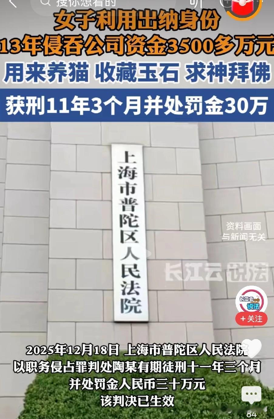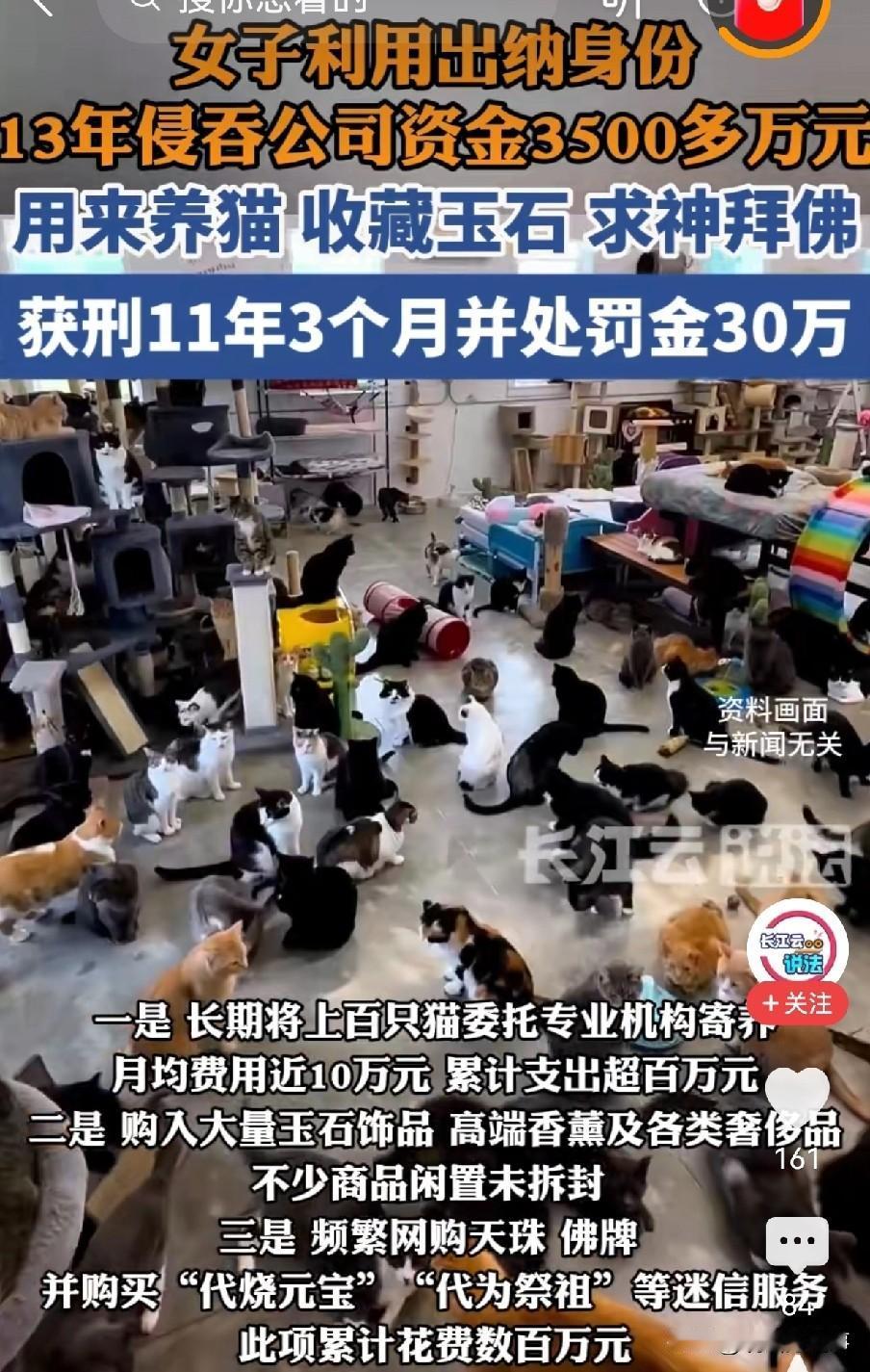 “养猫,收藏玉石,求神拜佛”,上海一女子用这三大爱好,利用自己出纳的身份,侵吞公司巨款3500万。 最后东窗事发,还是因为公司在2025年初,资金链出了问题才露馅,这姐们儿也是怂,一听说报警直接主动投案自首了。 经查证,在公司的13年间,她利用“阴阳制品”多次套取公款,又借助网银U盾直接转账侵占资金,妥妥的监守自盗。 贪来的钱一查归处,实在让人大跌眼镜,她的钱大多用在了三个地方,一是养猫,她爱猫程度远超旁人想象,100多只猫还委托了专购寄养,每个月养这些猫都要花费数10万。 然后就是疯狂买买买,专挑贵的来!什么高端玉石饰品、大牌奢侈品,还有各种高级香薰,家里堆得跟仓库似的,好多东西拆都没拆,全新的就搁那儿落灰。这哪是收藏啊,纯粹就是拿钱不当回事,满足自己的虚荣心。 最离谱的是第三个爱好,求神拜佛。这姐们儿不知道是亏心事做多了心慌,还是真被洗脑了,疯狂砸钱搞各种“信奉”的东西。什么天珠、佛牌买了一大堆,还花钱找人代烧元宝、代为祭祀,就指望各路“神仙”能保佑她平安无事。就这迷信开销,轻轻松松就花出去了几百万! 你说这叫什么事儿?拿着公司的血汗钱,养自己的猫、买没用的奢侈品、求虚无缥缈的神佛,最后落得个投案自首的下场!13年的暗度陈仓,终究是黄粱一梦,等待她的,是11年的牢狱,外加30万罚金。已于2025年12月18日,即刻判决生效。 如今这100多只猫,还有满屋子没拆封的奢侈品、佛牌,现在该咋处理?大家觉得这女出纳的脑回路到底是咋想的? (图片来自网络视频)