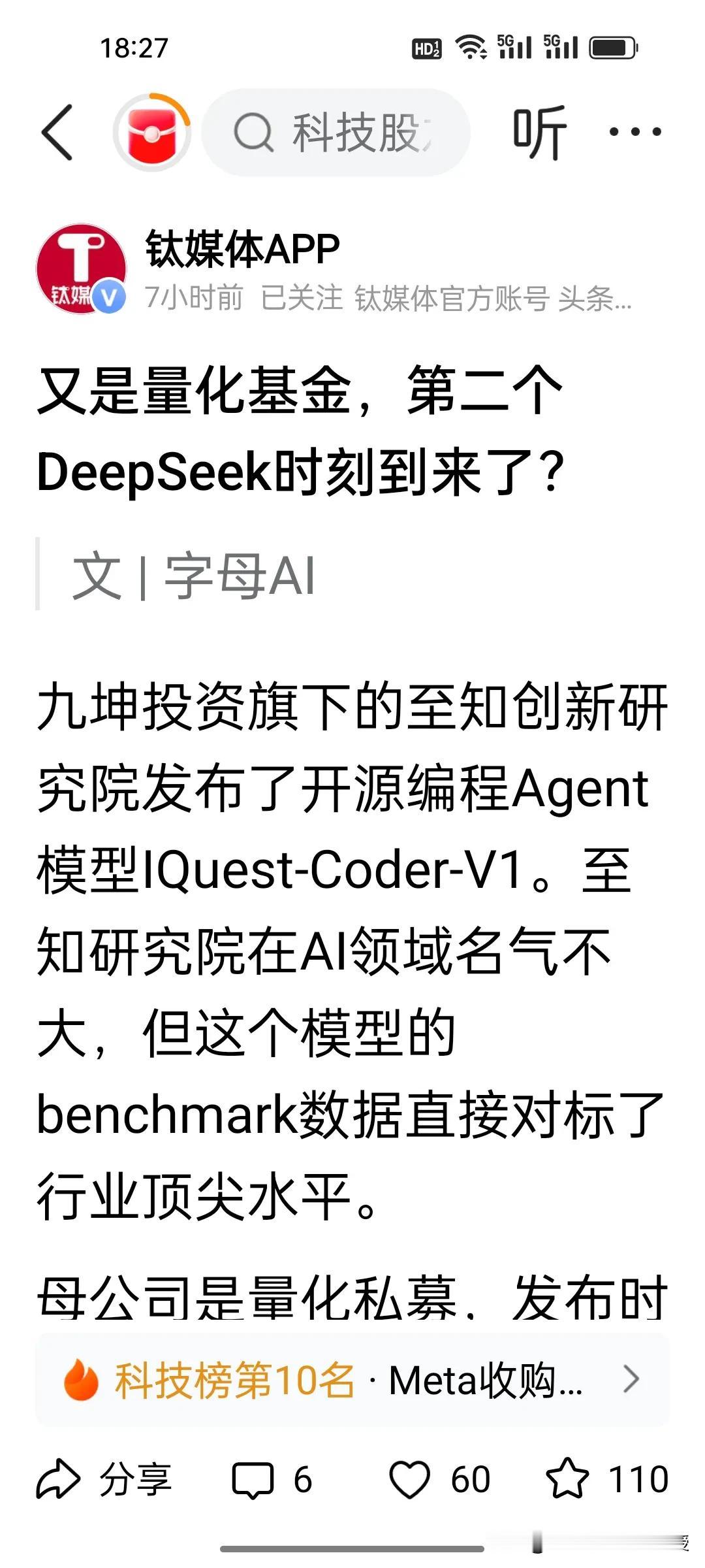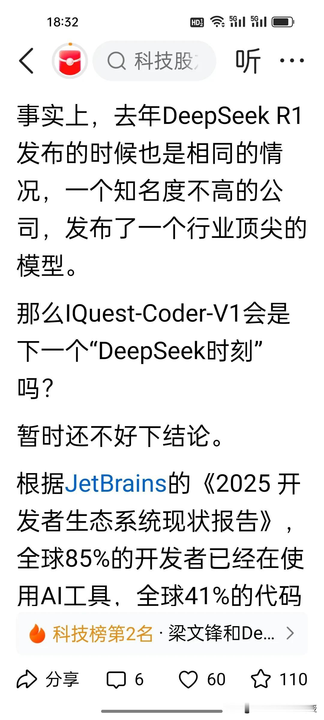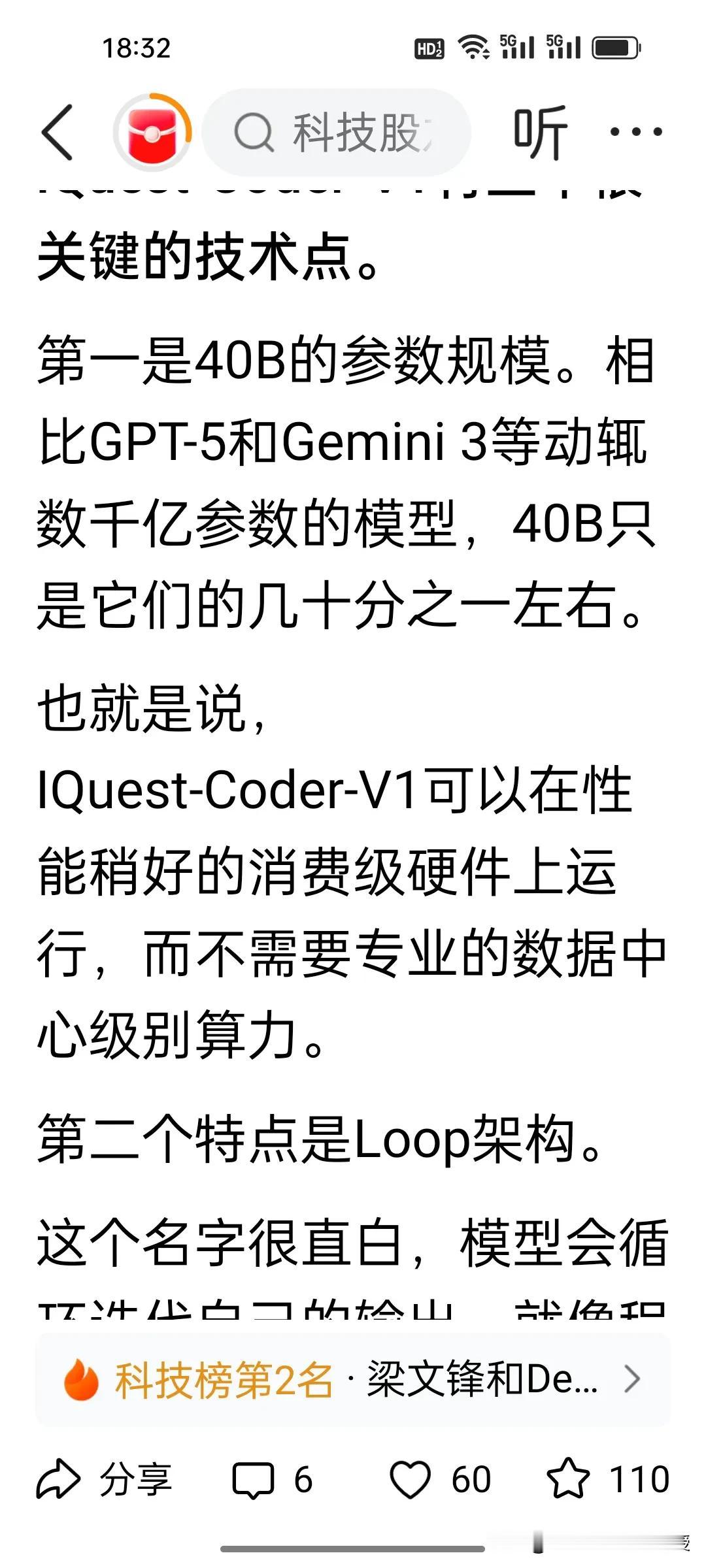梁文锋deepseek有新竞争对手了!还是“量化四大天王”的老熟人!根据《钛媒体》报道,新年伊始,量化私募迎来了AI对决!九坤叫板梁文锋DeepSeek。 去年初梁文锋DeepSeek横空出世,今年初,九坤IQuest-Coder-V1强势亮剑,很多人看不懂了,量化私募怎么在AI战场对决如此激烈? 这两者对比路径迥异:DeepSeek走通用路线,追求多场景覆盖;IQuest-Coder-V1深耕垂直领域,聚焦编程全流程自主执行。 看两者旗下的私募规模上,同属“量化四大天王”的梁文锋的幻方量化以700-800亿元领先,九坤紧随其后达650亿元。业绩方面,2025年幻方核心产品平均收益超50%,九坤则有部分基金承压。幻方量化去年业绩是百亿私募排行榜第二,大概为客户赚了400亿,梁文锋按照公司持股比例,大概能分70-120亿左右。 去年幻方量化规模大涨200亿,deepseek的风光无限也为幻方量化打了个持久的能量很强的广告,没想到昔日与九坤是量化同行,如今成AI赛道劲敌,当然九坤的新产品也是对其投资决策能力的如虎添翼,这场跨界竞争注定精彩!