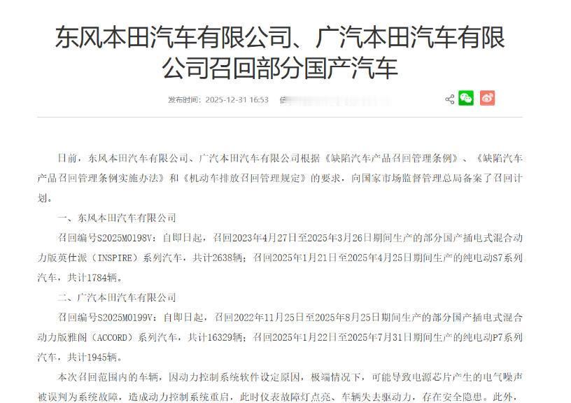 【因存不合理排放风险,广汽本田披露召回计划,】2025年最后一个工作日,广汽本田依据《缺陷汽车产品召回管理条例》等规定向国家市场监督管理总局备案了召回计划。宣布自即日起,召回2022年11月25日至2025年8月25日期间生产的部分国产插电式混合动力版雅阁(ACCORD)系列汽车,共计16329辆;召回2025年1月22日至2025年7月31日期间生产的纯电动P7系列汽车,共计1945辆。 召回原因则为存在不合理排放风险,广汽本田将免费为召回范围内的车辆升级软件,以消除安全隐患和不合理排放风险。值得关注的是,东风本田也因相同问题同步召回了相关车型。对于车企而言,进行召回无可厚非,但是也会在一定程度上对车主造成用车不便,对品牌形象造成不良影响,对于广汽本田此次召回,我们也将保持关注。【来自懂车帝车友圈】