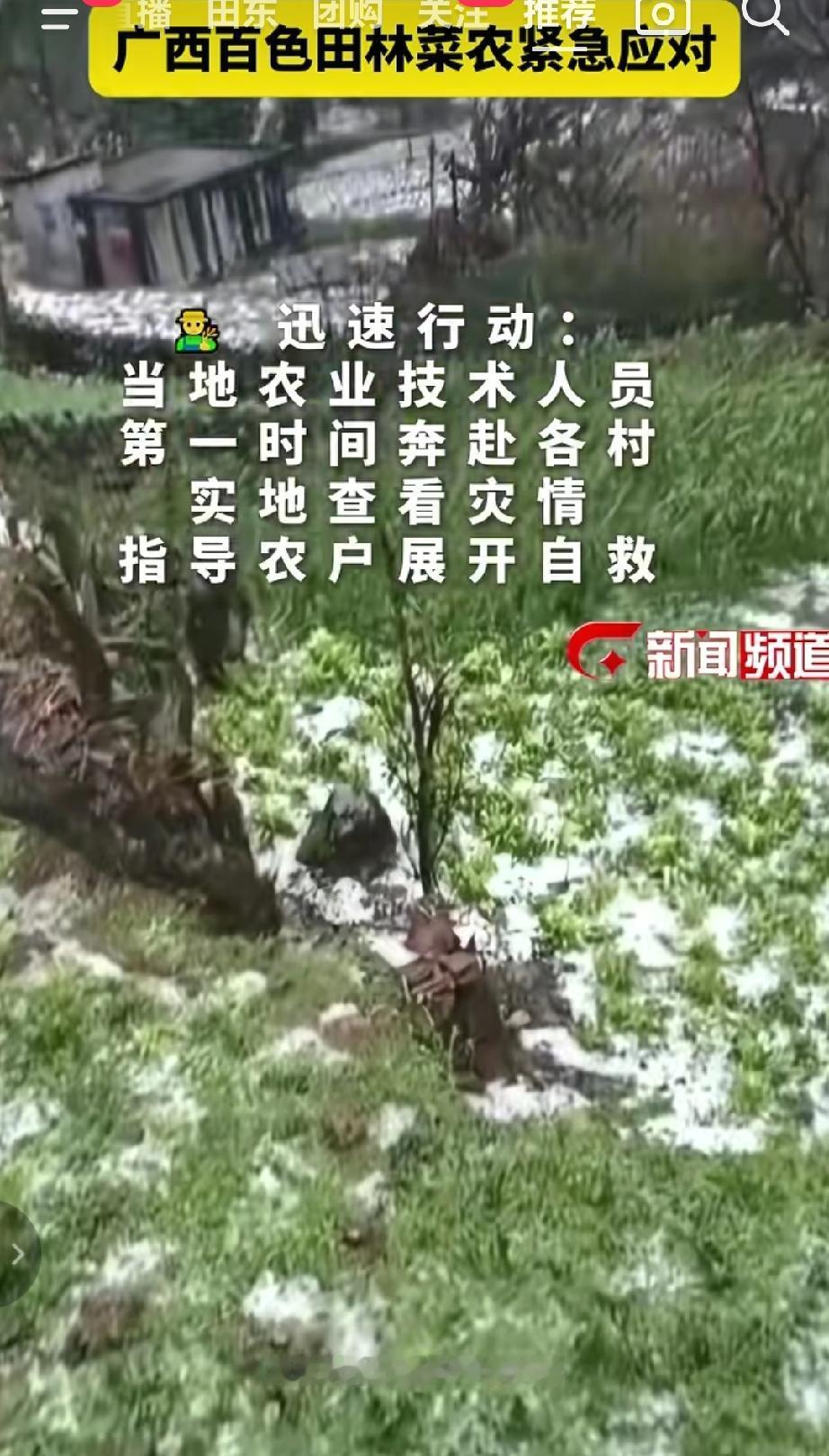 2026年1月1日凌晨,广西百色田林等地遭遇强冷空气带来的冰雹、雨夹雪天气,露天蔬菜种植区受损明显,菜叶被打穿、植株倒伏。当地农业技术人员第一时间奔赴各村实地查看灾情,指导农户展开自救。及时清理受损植株、加强防寒防冻保护、严防病虫害蔓延,全力把灾害损失降到最低,农业部门动态跟进,为农户提供后续技术支持。(来源于@广西新闻频道 )