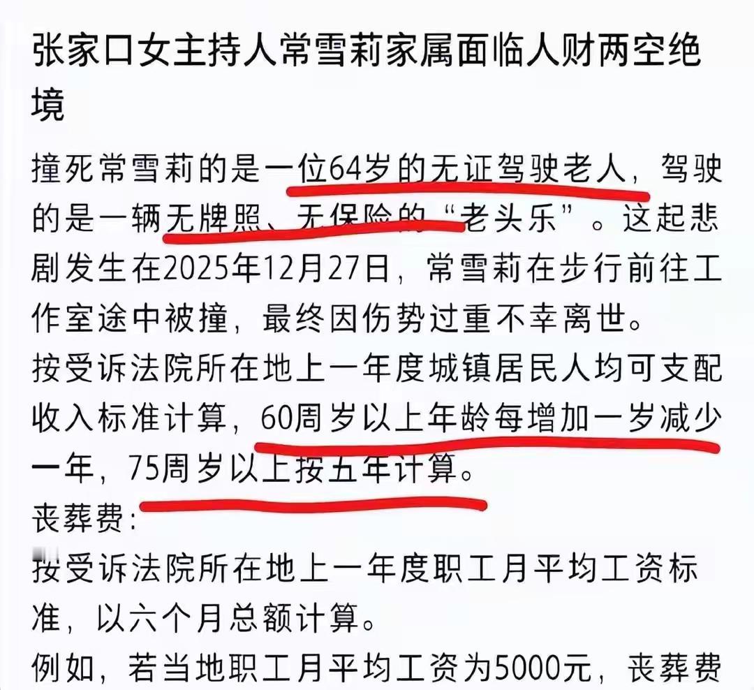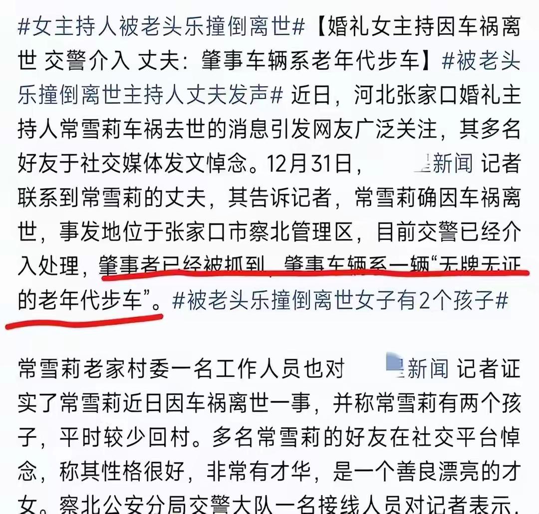 主持人常雪莉去世后续 丈夫首发声 肇事者64岁 面临人财两空 网友炸锅 河北38岁主持人常雪莉被无牌老头乐撞亡 丈夫发声肇事者64岁 事发在元旦前几天,河北这位叫常雪莉的婚礼主持人,38岁,去工作室的路上,被一辆无牌无证的老头乐撞了,人没了。 消息一出,整个网络瞬间炸锅。曾经活跃在婚礼现场、带给无数新人幸福的常雪莉,就这样突然离开了这个世界。她的丈夫在第一时间发声,哽咽而愤怒:“这是一起无辜的生命被无牌无证肇事者肇事的悲剧,我们要为雪莉讨个公道!”这句话,不仅仅是对爱人的控诉,更像是一声呐喊,唤醒了许多人的愤怒与无奈。 令人震惊的是,肇事者竟然是一位64岁的老人,完全没有任何合法驾驶资质,也没有任何安全意识。这起事故的背后,隐藏着多少社会的隐患?无牌无证驾驶、老龄化社会中部分人的安全意识淡漠、甚至是对生命的漠视,都在这一瞬间暴露无遗。有人说:“这不是一起简单的交通事故,而是社会管理漏洞的缩影。”确实,面对如此严重的失控,我们不得不问:我们的交通安全体系,到底出了什么问题?又有多少类似的隐患被忽视、被埋藏? 网友们在评论区炸开了锅。有的愤怒指责:“这样的肇事者,早该被严惩!为什么还会出现无牌驾驶?难道生命在他们眼里就这么轻?”,也有人开始反思:“这不仅仅是一个人的悲剧,更是制度的缺失。没有严格的监管,没有有效的惩罚,才会让这些危险分子肆无忌惮。”更有人担心:“如果没有及时的法律惩治,难道以后还会有更多无辜的生命被夺走?” 而常雪莉的丈夫在发声中透露出一种深深的无助:“雪莉一直热爱生活、热爱工作,她的梦想是用自己的主持带给人们快乐。如今,她的生命就这样被无牌驾驶者轻易夺走,令人心碎。”这句话像是一记重锤,击中了每一个人的心。我们不禁要问:这样的悲剧,难道还要不断重演吗?社会的底线在哪里?我们每个人又能为这场悲剧做些什么? 这起事故,似乎是一面镜子,映照出社会中许多被忽视的角落。它告诉我们,生命的脆弱,安全的底线,绝不能被忽略。它也提醒我们,每一个生命都值得尊重,每一个制度都需要严格落实。或许,我们不能改变已发生的悲剧,但可以从中汲取教训,努力让未来少一些这样的无辜离去。 常雪莉的离去,是一场悲剧,但更希望它成为一次警醒。让我们共同呼吁:加强交通监管,严惩无牌驾驶,让每一个生命都能在阳光下自由呼吸。也许,只有这样,我们才能真正为那些逝去的生命,留下一份尊重与守护。