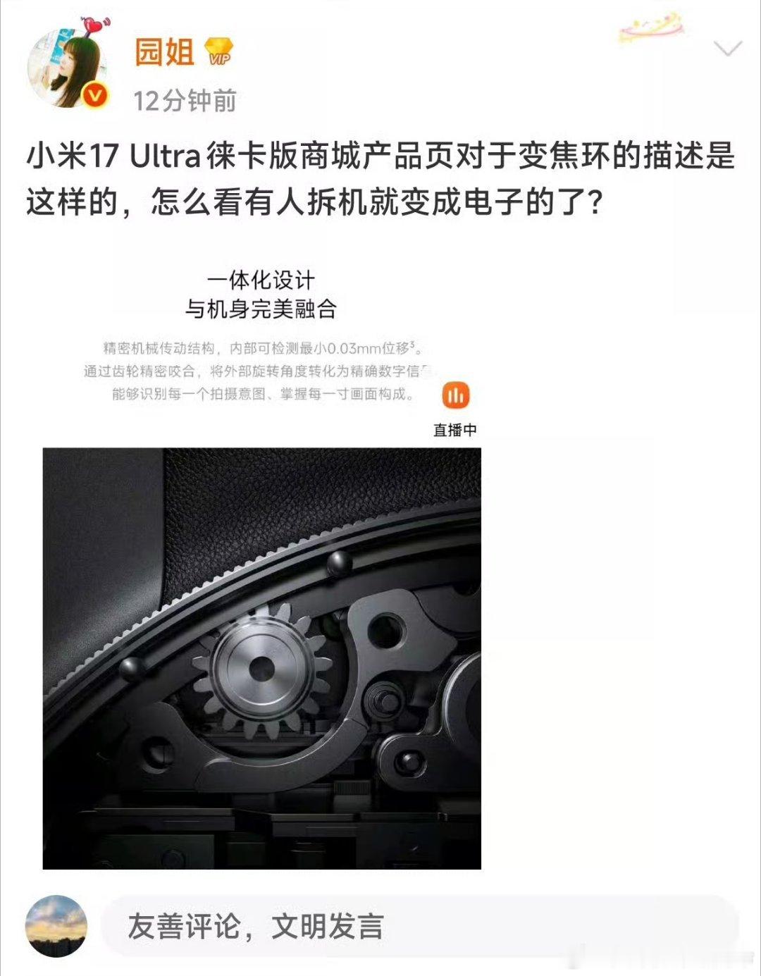 杨长顺没拆到反面,反面是有机械齿轮的,而且现在很多相机也是机械结构转换电子信号的只看自己想看的,后面几句直接忽略,还觉得自己倍清醒,又抓住了巨大漏洞,殊不知在正常人眼里和傻缺一样与其喷这个不如直接说小米17ultra拍照垃圾算了,毕竟拍照垃圾只能证明审美不行,喷这个是真的证明智商不行