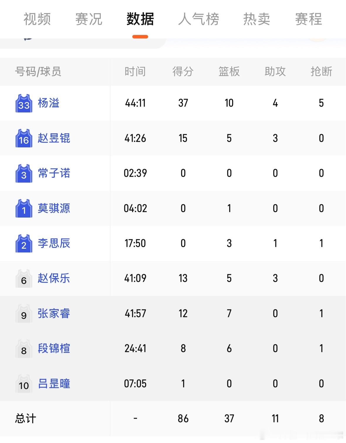刚刚结束的全国U19青年篮球联赛的决赛中,广东宏远U19男篮与上海U19男篮历经加时赛才分出胜负,最终广东以86比92遗憾惜败上海取得亚军!杨溢出战接近45分钟,拿下全队最高的37分,外加10个篮板4次助攻及5个抢断。杨溢赶紧回一队吧,徐杰受伤了,没有组织后卫,你的机会来了!另外,夏振锋没有参加决赛,不知道是否因为伤病问题。