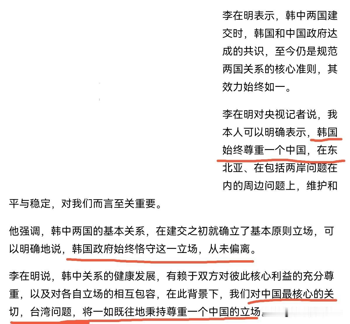 李在明有大智慧!人还没有来中国访问,李在明先作出了重要表态,引发极大关注!1月2日,根据岛内媒体报道,即将访华的韩国总统李在明在接受采访时表示,韩中两国建交时,韩国和中国政府达成的共识,至今仍是规范两国关系的核心准则,其效力始终如一。 我本人可以明确表示,韩国始终尊重一个中国,在东北亚、在包括两岸问题在内的周边问题上,维护和平与稳定,对我们而言至关重要。韩中关系的健康发展,有赖于双方对彼此核心利益的充分尊重,以及对各自立场的相互包容。在此背景下,我们对中国最核心的关切,台湾问题,将一如既往地秉持尊重一个中国的立场。 不得不说,李在明有大智慧。李在明人还没有来中国,就在我们最关心的问题上作出了明确,且毫不含糊的表态。这说明什么呢?这说明李在明非常清楚,尊重我们的核心利益,就是在打牢中韩合作的基础。我们的元旦假期是1月3日结束,李在明1月4日-1月7日访华。也就是说,在我们新年的第一个工作日,李在明就率团来访,这说明李在明是以最高优先级在恢复对华关系。 并且,李在明访华时间长达4天,这是超出常规的外交规格。无疑,李在明来访华,这不仅要谈合作,还要把合作谈深谈透。鉴于当下中日关系恶化,李在明此时率领200多名企业家来华访问,可以说非常的会抓时机。事情是明摆着的,日韩两国有产业竞争关系,中国市场对于韩日两国都非常重要。 李在明借此机会深化对华经贸合作,这无疑是抢得了先手。也难怪日本国内对于李在明访华非常的有情绪,因为在李在明访华行程敲定之前,日本经贸代表团一直在寻求访华,但是直到现在都仍无准信。而反观韩国呢?李在明人未到,先定调,局面可以说顺风顺水。不得不说,李在明的外交是有手腕的,我们相信中韩关系将彻底走出低谷,呈现新的局面。