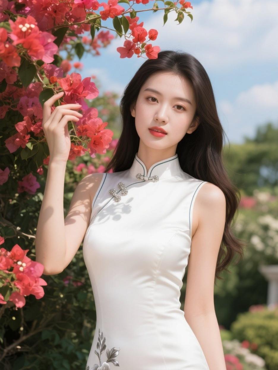 《素襟映三角梅》 白缎裁云绾素襟, 银钗轻扣玉颈深。 手拈三角梅枝艳, 一抹红芳映雪身。 赏析:这首诗紧扣画面核心意象展开:首句以“白缎裁云”喻白色旗袍的质感与造型,“素襟”点出旗袍的素雅基调;次句“银钗轻扣”描摹旗袍盘扣的精致,“玉颈深”衬出旗袍立领的古典韵味。后两句将人物与三角梅相融,“手拈枝艳”还原画面中女子轻触花枝的动作,“红芳映雪身”以三角梅的艳红对比旗袍的洁白,色彩反差勾勒出清雅又明艳的视觉效果,寥寥数笔把东方女子的温婉与花景的鲜活交织,意境灵动。粉袖雅韵 新中式烧花旗袍 盘扣丝绒裙 墨影竹蝶盘扣裙 定位花双层旗袍 盘扣开叉礼服 金缕梅汉服