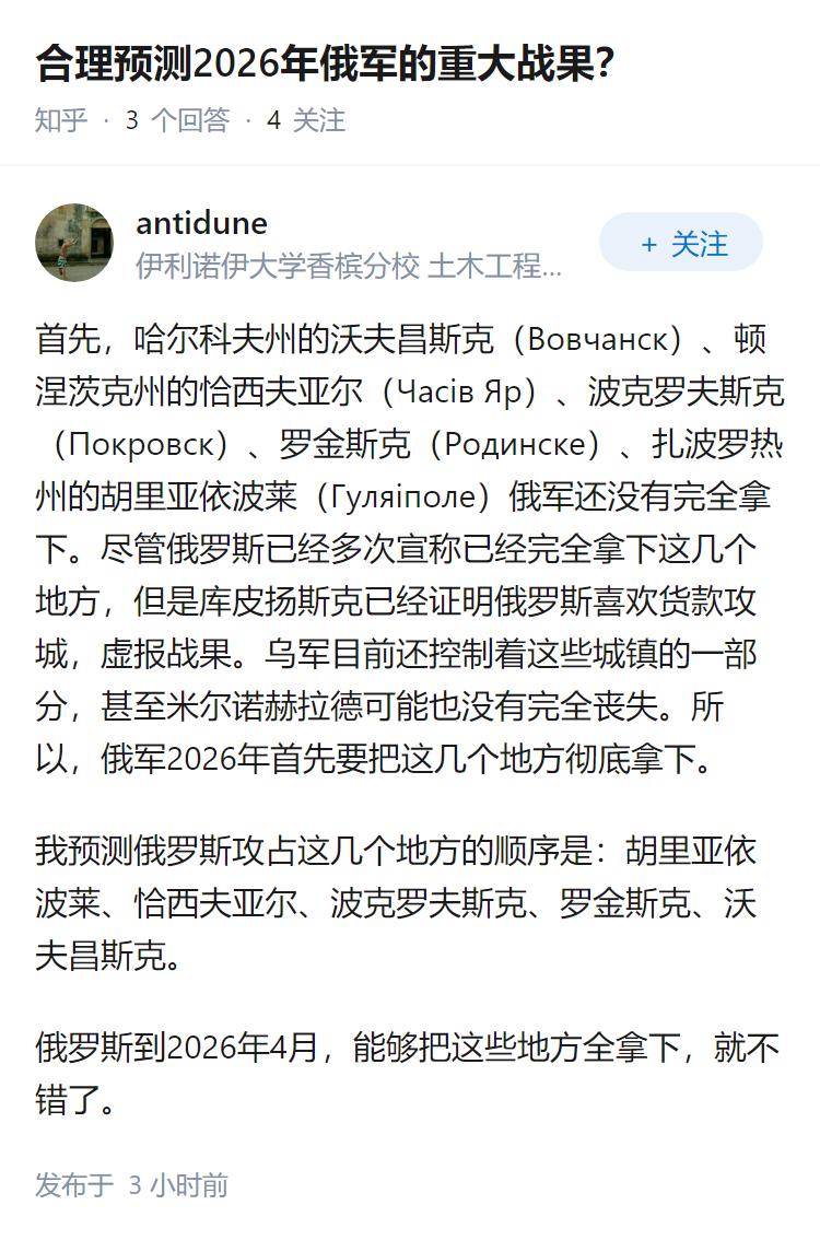 阿白 2 2026-01-03 15:17 预测个屁。这些地方除了库皮扬斯克乌到处抽人打反攻其余的就别做梦了。至于26年还是想想能不能守住扎不罗热市吧。。按东部集群现在的进度5个月内应该就能打到扎不罗热主城区了[哭着笑]