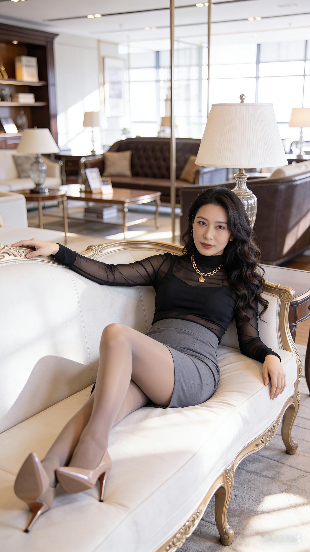 《厨房里的蓝色优雅》在现代风格的厨房内,一位女性身着蓝色修身长裙,宛如一道亮丽
