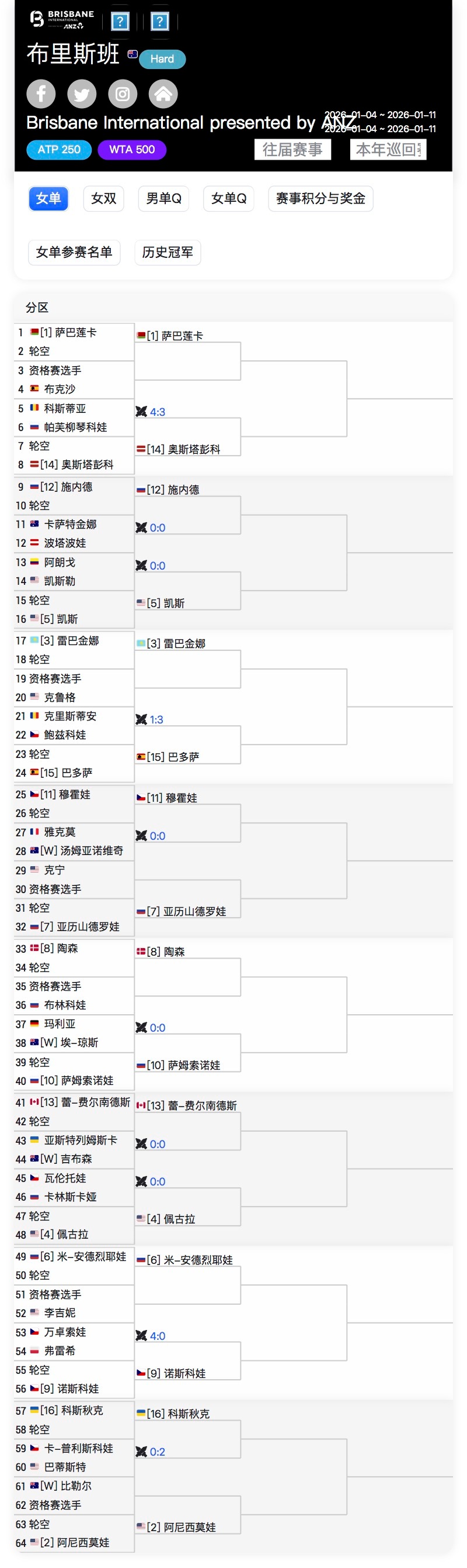 WTA500布里斯班赛单打签表👀难度很高的48签,萨巴、莱巴、阿曼达、大富、凯斯、压力娃、小米辣七位世界前十齐聚,当然还有我们前世界第一散步小姐复出空降散满贯看好谁夺冠?🏆体育大赏热点解读