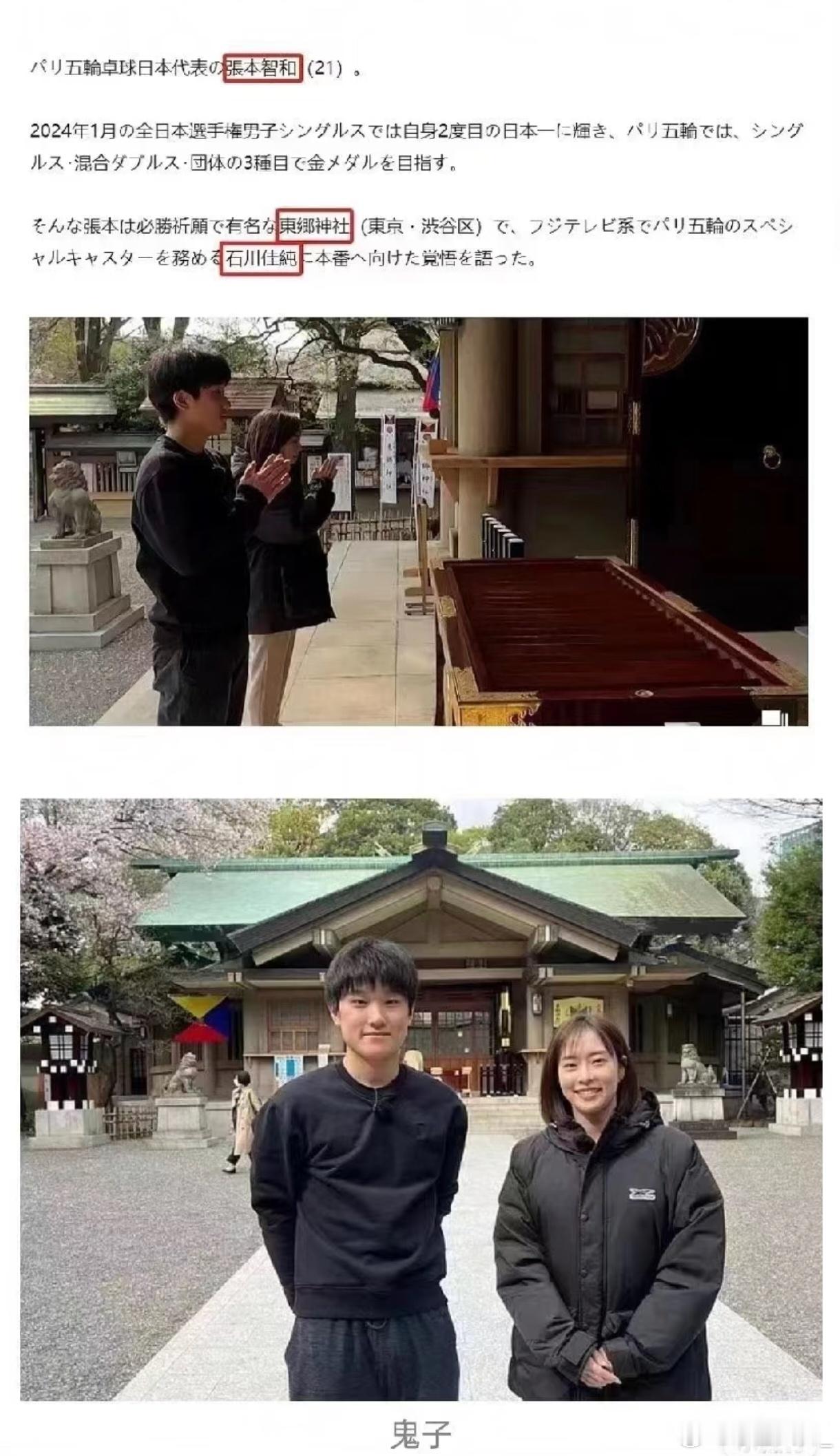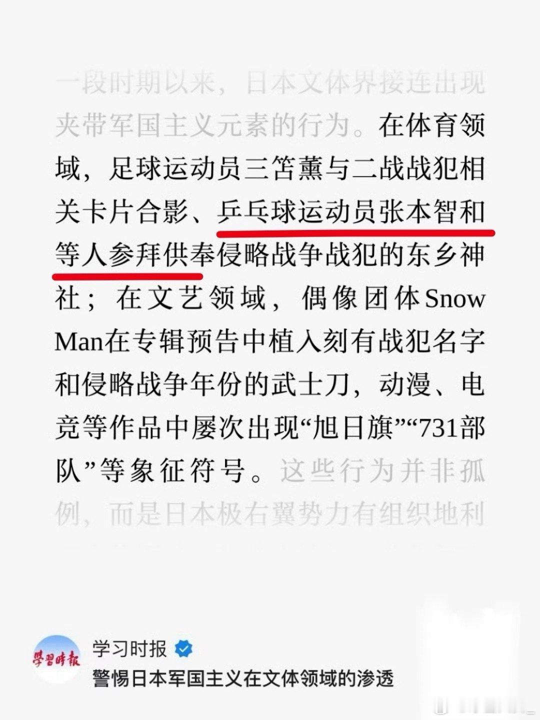 张本智和被点名为什么还要让他来我国进行训练,明明知道他已经彻头彻尾的变成日本人了,为什么还要让他来?作为一个中国人,身上流着中国人的血,虽然他改了国籍,如果他不去拜什么狗屁神社,我们还没有那么排斥他!可是他们一家都忘祖,去拜了曾经杀害我们前辈的日寇刽子手!血淋淋的历史他们忘得一干二净,中国人的耻辱啊!你可以移民但不能拜鬼!这不仅是卖祖还在用刀灭祖!看看每次比赛,账本的嚣张跋扈,狼一样的叫嚣,在上次香港总决赛中还引用了高市早苗的名言!该警惕了,所有喜欢乒乓球的国人不要忘记历史,不要讲体育无国界,娱乐无国界,在国家的大是大非面前,爱国是每个中国人的义务,牢记使命,勿忘国耻,爱我中华!