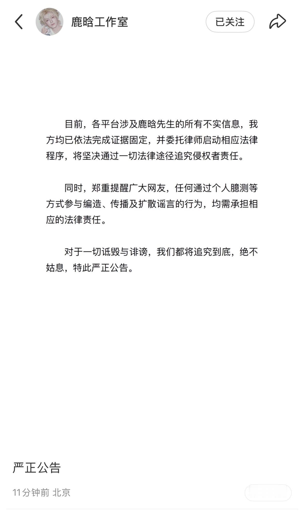 鹿晗工作室今早在不同的平台以及INS发了声明回应辟谣