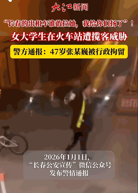 “绝不能放过他!” 吉林长春火车站,两名女大学生刚出站,一名男子热情迎上来拎行李,本以为是好心相助,没想到把她俩领到出租车前,平时三四十的打车费,男子开口就要70元,遭拒后,还想索要香烟当酬劳,被拒后更是破口大骂,大吼:“长春的出租车谁敢拉她俩”,威胁要扬了女生的行李,嚣张态度令人发指。 交通枢纽就是城市给外人的第一印象,本来该是秩序井然、让人觉得暖心的地方,但吉林长春火车站发生的这起揽客纠纷,直接让这份城市温度凉了半截。 两名女大学生刚结束行程出了长春站,一名陌生男子就主动凑上来,热情地接过她俩的行李,全程都显得特别热心,这让第一次来这儿的女生还以为碰到了好心人。 可谁能想到,这男子的热心全是装的,带着目的性,径直把两人领到火车站前的一辆出租车旁边,这时候才露出了宰客的真面目。 这段路程平时打车也就三四十块钱,他张口就敢要七十,比正常价格高出了不少。 面对这样不合理的要价,女生当场就拒绝了,可这男子并没打算就此罢休,又改口说要几包香烟当“帮忙拎行李”的酬劳,想换个方式占便宜。 没想到这个要求又被拒绝了,男子这下彻底撕破了伪装,情绪一下子失控,开始当众撒泼骂人,甚至放下狠话:“长春的出租车谁敢拉她俩”,想用这话威胁周围的出租车司机,不让他们接这两个女生的单。 更过分的是,他还扬言要把女生的行李扔了、毁了,整个过程里,男子态度特别嚣张,说话做事都带着攻击性,现场气氛一度很紧张。 这事儿在网上发酵后,网友们的讨论一下子就炸开了锅,各种声音都有,但核心都是批评这种乱象,希望能好好治理。 有网友直接说,这男的就是个“站霸”,专门挑学生这种社会经验少的人下手,根本不是简单的揽客纠纷,就是明晃晃地破坏公共秩序。 还有长春本地的网友爆料,说这种黄牛早就长期待在火车站周边了,专门盯着外地游客坑,随便漫天要价都是常事儿,就连本地市民都躲着他们走,能看出来这种乱象已经存在很久了,根深蒂固。 城市形象就像易碎的瓷器,建起来不容易,毁了却很简单,火车站作为城市的第一扇窗口,这儿的秩序好不好、有没有温度,直接影响着大家对这座城市的第一印象。 长春站这次的揽客闹剧,既是一次警告,也是一次改进的机会,只有拿出彻底整改的决心,用既能治标又能治本的办法筑牢防线,才能把城市窗口擦亮,重新赢回大家的信任。 毕竟,一座城市真正的竞争力,不只是靠优美的风景和齐全的设施,更在于是否有完善的法治、精细的管理,以及人与人之间的温暖。 这才是每座城市在发展旅游、推进城市治理过程中,最核心、最不能少的东西。 信息来源:大江网