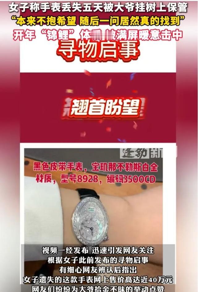 长沙五一广场惊现“树梢保管员”!68岁大爷捡40万名表不昧,挂树五天等来失主,全网泪目:这才是真正的“路不拾遗” (来源:综合自网络) 清晨的五一广场,车水马龙还未完全苏醒。一位满头银发的大爷,像往常一样在公园里舒展筋骨。他的目光掠过地面时,忽然被一道低调却难掩华贵的光泽攫住——那是一块静静躺在草丛里的手表。他没有丝毫犹豫,弯腰拾起,却在下一秒,做出了一个让全网争论不休的决定。 他没有将表放入口袋,也没有走向远处的警务站。只见他端详片刻,走到一棵枝桠遒劲的老树下,踮起脚尖,小心翼翼地将那块表挂在了最显眼、伸手可及的枝头。表盘朝外,仿佛树上结出了一颗名为“诚信”的果实。随后,他退到不远处的长椅坐下,如同一位沉默的守护者。 这块表,并非寻常之物。事后网友火眼金睛认出,这是某顶级品牌的经典款式,市场价逼近四十万元。而在大爷眼中,它没有标签上的天文数字,只有一个最朴素的定义:别人丢的紧要东西。他的逻辑简单而直接:失主必定心急如焚,沿路寻回是人之常情。挂在原点,最是醒目。 五天,整整五天。这块价值不菲的腕表,经历了日晒与晨露,安然悬挂于枝头,竟无人私自取走。这本身就是一个微缩的奇迹,映照出城市一角的文明底色。直到那位几乎绝望的失主女士,抱着最后一丝侥幸前来询问,大爷平静的一句“我知道”,瞬间点燃了她所有的希望。 当女士跟随大爷来到树下,看见失物以这样一种意想不到的方式“保管”着,那一刻的冲击,远胜于财物复得。她说:“这是我26年来最幸运的一天。”这份幸运,是失而复得的欣喜,更是穿越人海、与一份毫无杂质的美善不期而遇的震撼。大爷用最“土”的办法,践行了最“高级”的诚信。 视频传开,网络沸腾。有人为大爷的淳朴智慧点赞,称这是“民间智慧的闪光”;也有人担忧,万一被他人顺手牵羊,大爷岂非要担责?法律界人士的提醒不无道理:拾得贵重物品,交公是最稳妥、免于纠纷的方式。这份理性探讨,同样珍贵。 然而,在点赞与争议之上,有一种更动人的情感在流淌。我们为何会被深深触动?因为在大爷身上,我们看到了一个渐渐远去的背影——那种基于纯粹信任的处世哲学。他相信失主会回来,相信路过的人不会乱动,相信“挂在那里”就是最好的办法。这份信任,笨拙却滚烫。 在这个有时连扶老人都需思量再三的时代,大爷的“神操作”像一束光,照见了我们内心对“路不拾遗,夜不闭户”的深切渴望。它让我们相信,无论科技如何发达,人心最本真的善与信,依然是社会最珍贵的压舱石。它不复杂,却拥有直抵人心的力量。 故事的最后,女士想酬谢,大爷婉拒。于他而言,这不过是“一件小事”。正是这无数“小事”,垒砌起社会道德的堤坝。我们不必神话大爷,也无需苛责方法,只需记住这份温暖的初衷。下次若拾获他人物品,或许我们会多一份耐心,多一份将心比心。 这个发生在长沙五一广场边的暖心插曲,已然超越了事件本身。它是一次全民关于善意、信任与文明方式的温暖共鸣。让我们守护这份感动,也愿每一位“张大爷”的善举,都能被温柔以待,让“物归原主”的故事,永远带着人心的温度。 社会温暖 信任无价