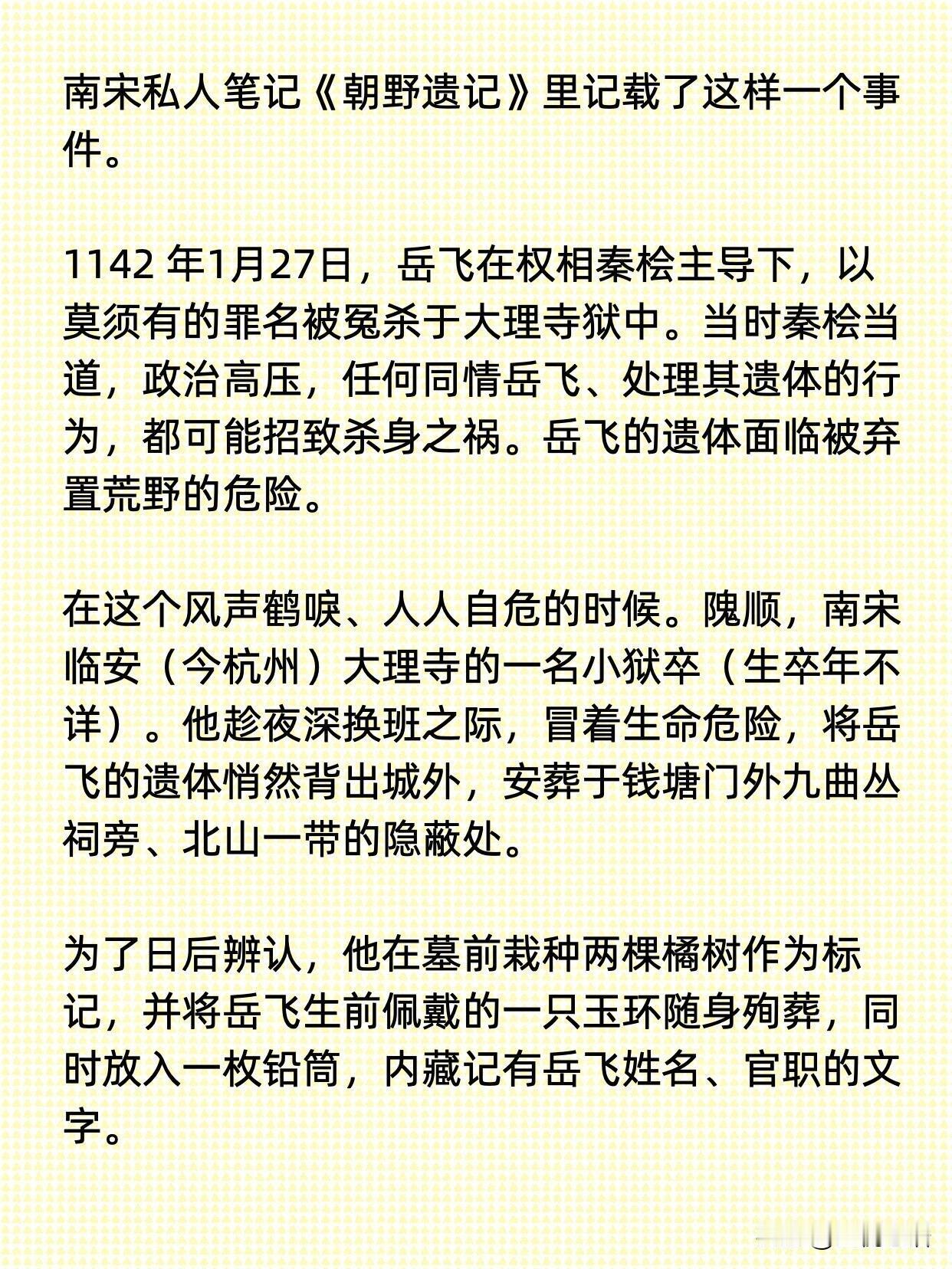 南宋小狱卒有多勇? 凭一己之力守住民族大义 真的被隗顺这个小人物狠狠戳中了! 1142年岳飞含冤而死, 秦桧当道的年代,谁敢替“罪臣”出头? 偏偏是临安大理寺一个普通狱卒, 趁深夜悄悄背走岳飞遗体。 埋在隐蔽处,栽橘树为记, 放玉环和铅筒留证,守了二十年秘密。 直到临终前, 才把真相告诉儿子,盼着朝廷平反。 二十年后宋孝宗为岳飞昭雪, 多亏隗顺的遗言,英雄才得以迁葬岳王庙。 他没有高官厚禄, 没有青史留名的野心,只凭一腔朴素的忠义。 在人人自危的黑暗时刻,做了最勇敢的事。 历史从不是只有大人物书写, 隗顺这样的小人物,才是道义的底色。 这份藏在尘埃里的勇气,值得我们永远铭记!