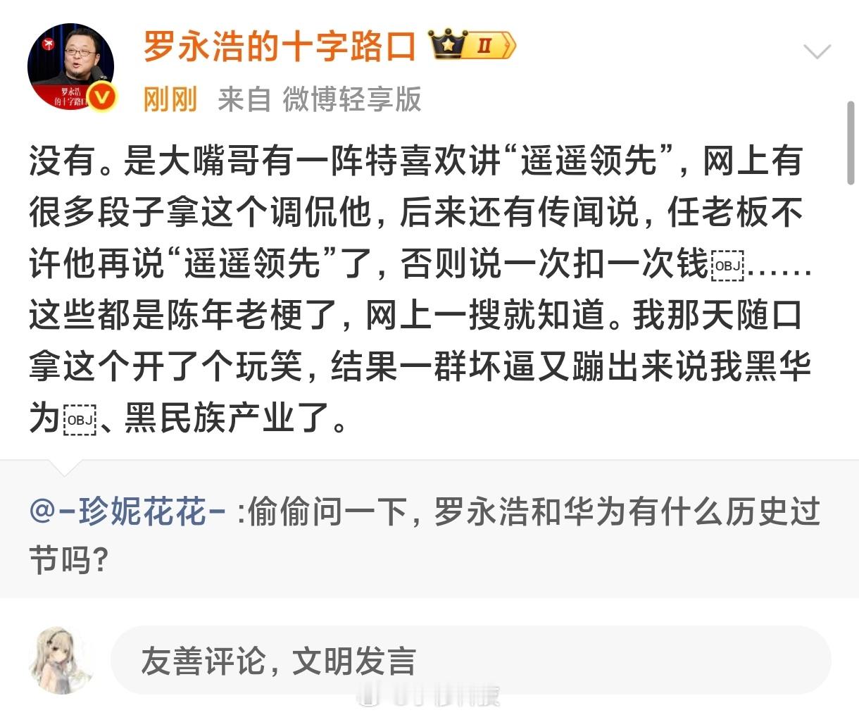 罗永浩回应遥遥领先老罗回应了科技春晚遥遥领先的言论,大家怎么看? 罗永浩说和华为没有过节
