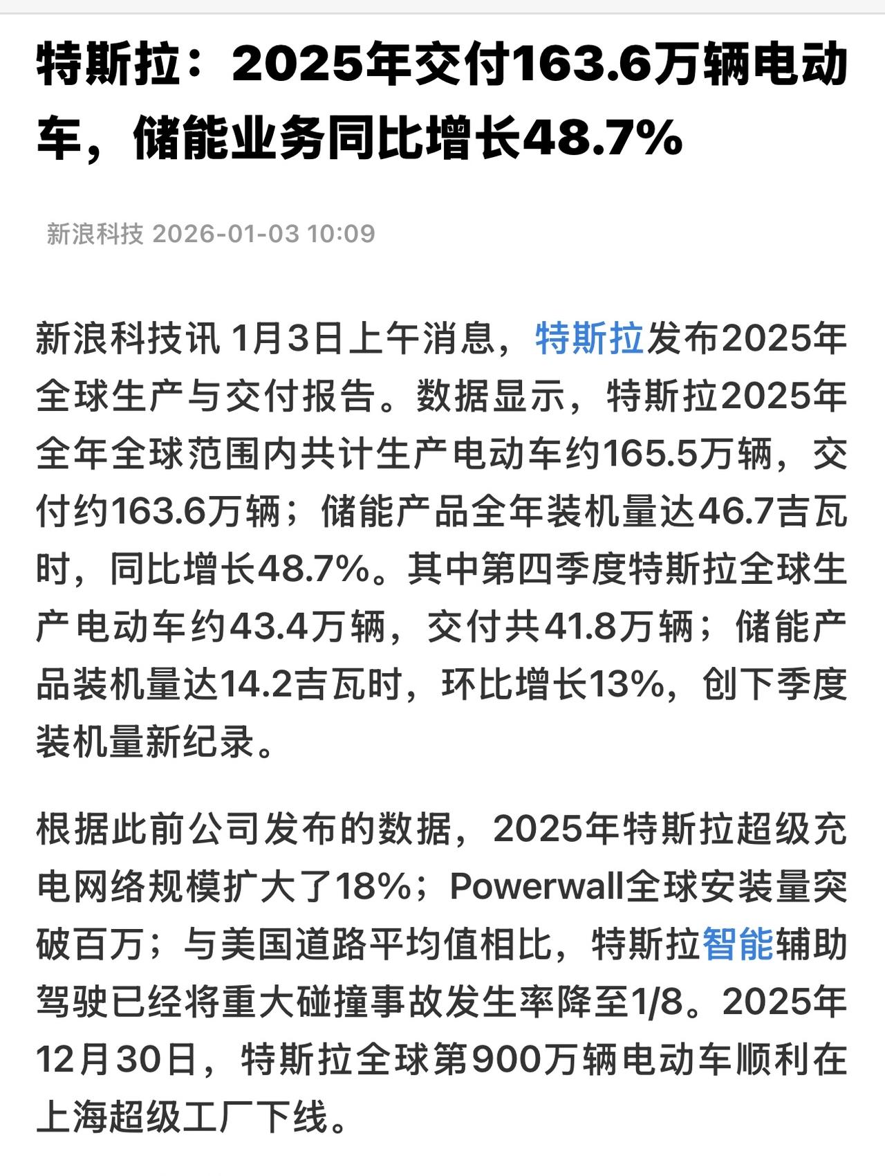 特斯拉去年销量下滑近9%电动车龙头地位让位比亚迪 特斯拉2025年交付不到164万辆,同比下滑8.6%,连续两年下降。同期比亚迪纯电车型销量超过225万辆,首次在年度销量上超越特斯拉,成为全球纯电汽车销冠。 不过,数据显示,特斯拉储能业务维持高速增长态势。从2025年全年来看,尽管销量承压,但特斯拉股价总体持续上涨,并在去年12月底创下历史新高,市值一度超过了1.6万亿美元。 截至昨日收盘,特斯拉股价跌2.59%,市值1.46万亿美元。比亚迪目前市值逾8900亿人民币。
