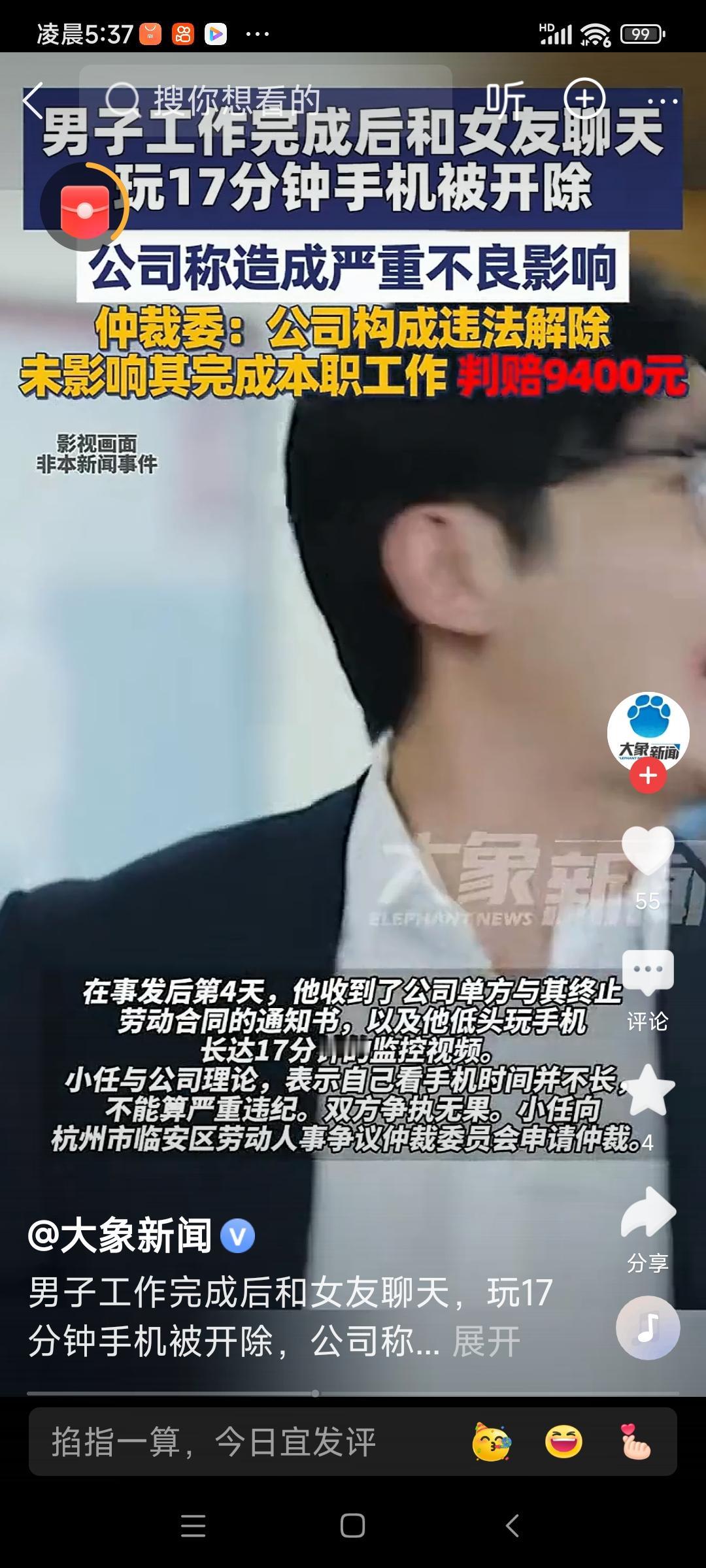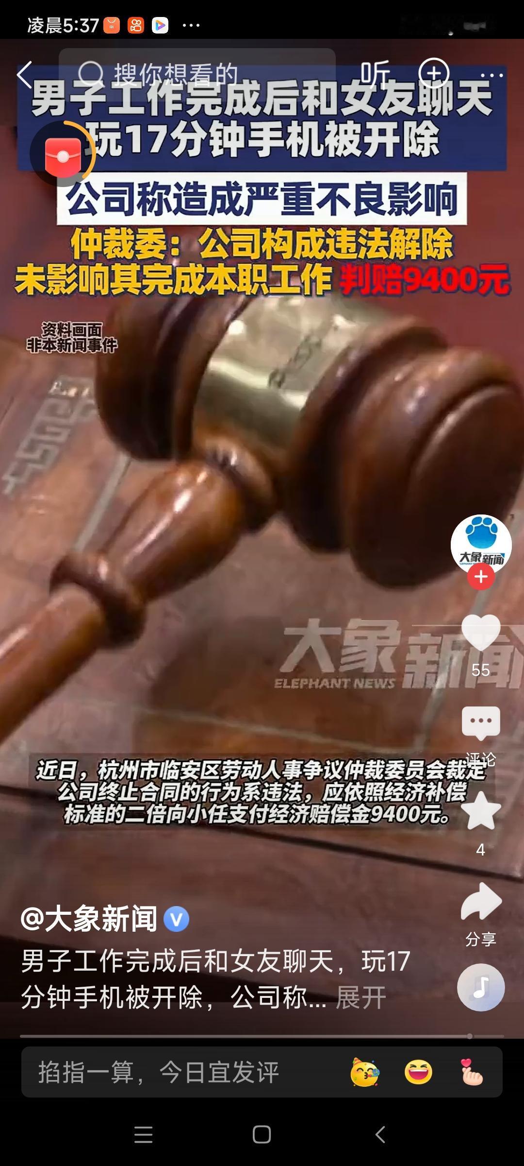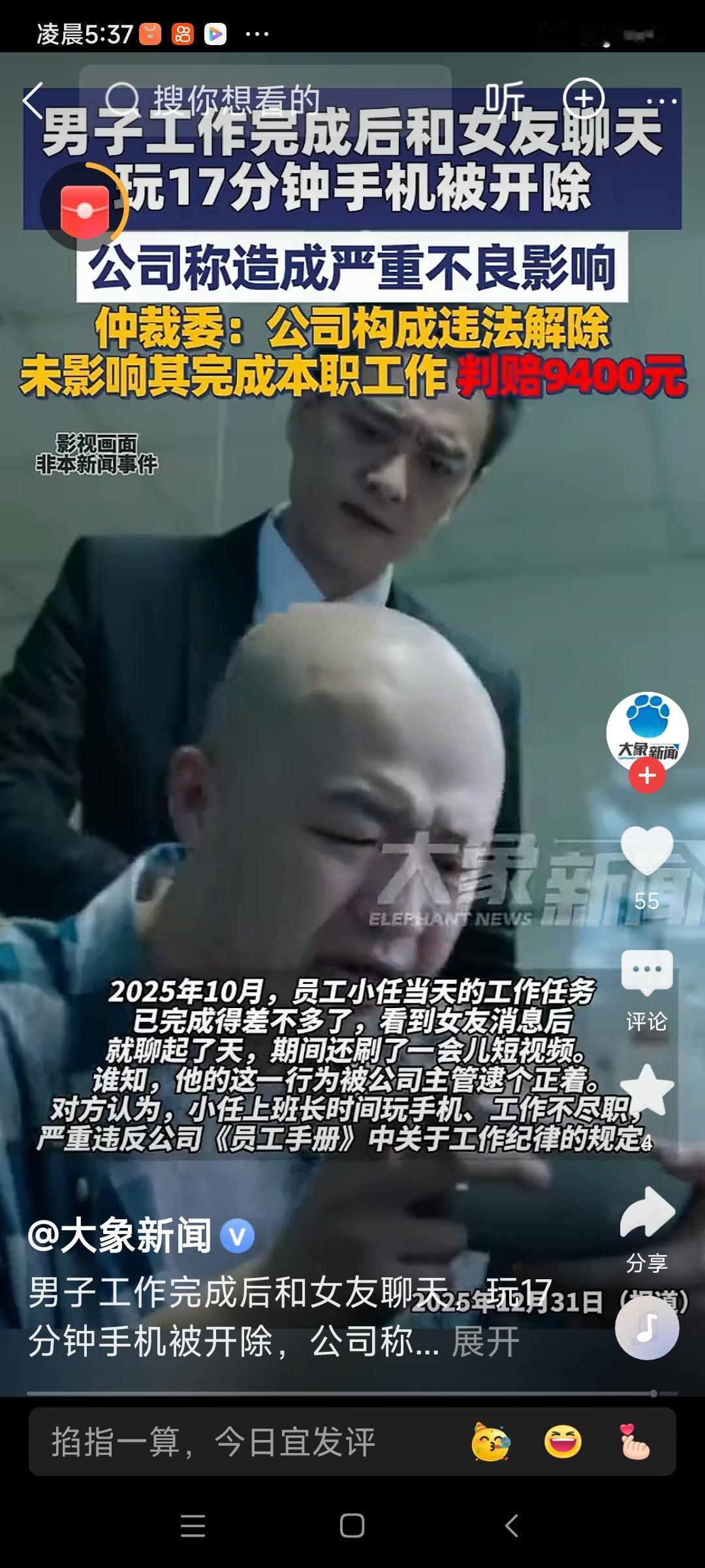 震惊!男子工作仅17分钟玩手机被公司开除,竟然还获赔9400元!背后真相令人震撼! (来源:大像新闻) 你是否也曾在工作中偷偷玩过手机?但你知道吗?一次简单的“玩手机”行为,竟然能让你丢掉工作,还能获得赔偿!今天的故事,绝对让你大开眼界!一个普通的上班族,小任,只是因为在工作时间玩了17分钟手机,竟然被公司开除,然而令人意想不到的是,法院还判公司赔偿他9400元!这背后到底发生了什么?快来看看这个令人震惊的案例! 故事发生在2025年的秋天,地点是杭州临安区。一切都看似平凡,但一场关于“手机玩耍”与“劳动权益”的争议,瞬间点燃了网络热议的火焰。 那天,小任刚刚完成了当天的工作任务,心情还算轻松。他和女友在微信上聊着天,顺便刷了会儿短视频放松放松。谁曾想,这个看似普通的休息片刻,竟然成为他职业生涯的“转折点”。 公司主管突然出现,盯着他看了几秒钟,然后严厉地说:“你在上班时间玩手机,这严重违反了公司纪律!”当时,小任还没多想,觉得自己只是休息一下,没想到这短短的17分钟,竟然成为公司开除他的“罪证”。 公司方面,坚称小任的行为“严重影响了工作纪律”,因此决定终止劳动合同。公司还出示了《员工手册》,里面明确规定:在工作时间不得玩手机,否则视为严重违纪。公司认为,小任的行为“造成了不良影响”,必须严惩,否则会带坏风气,影响其他员工的工作纪律。 然而,小任本人坚持自己只是短暂休息,没有影响到工作,也没有造成严重后果。他觉得被公司如此处理,太过严苛,甚至有些不公平。 于是,小任选择了法律途径,向劳动仲裁委员会提出申诉。他主张:自己工作了将近11个月,月薪4700元,因公司无故单方面解除劳动合同,应该获得经济赔偿9400元。 公司方面则坚称:他的行为“严重违反规章制度”,应当依法解除合同。 案件进入仲裁程序后,裁判的焦点集中在:这个“17分钟玩手机”的行为,是否构成“严重违纪”?公司能否因此解除劳动合同?最终,仲裁委给出了令人震惊的裁决——公司解除合同的行为系违法,应支付小任9400元的经济赔偿。 这起案件引发了广泛讨论:员工在工作时间玩手机,能否成为被开除的理由?公司制定的规章制度是否合法?员工的权益又该如何保护?答案,远比你想象的复杂。 其实,关于“上班玩手机”这件事,法律和管理的界限一直存在争议。用人单位有责任制定合理的规章制度,但同时也要遵守法律法规,不能随意处罚员工。 根据《劳动合同法》和相关司法解释,用人单位可以制定规章制度,明确禁止在工作时间玩手机等行为,但这些制度必须合法、合理、公开,员工必须知晓。 如果员工在工作中偶尔玩手机,未影响到工作任务的完成,一般不构成严重违纪,更不应因此被解雇。反之,如果玩手机影响了工作,或者造成了严重后果,单位可以依据规章制度进行处罚。 在本案中,仲裁委认为,小任的行为“没有影响到工作任务的完成”,也没有造成“严重不良影响”,因此不能认定为“严重违纪”。公司单方面解除劳动合同,属于违法行为,应当支付赔偿金。 这个判决,给了许多上班族一剂“定心丸”。即使在工作中短暂休息,也不能随意被扣上“严重违纪”的帽子,更不能随意被解雇。 那么,作为员工,我们该如何应对类似情况?又该如何保护自己的权益呢?这里有几点建议:首先,严格遵守公司规章制度,避免长时间玩手机;其次,若觉得规章制度不合理或处罚过重,可以通过法律途径维权;最后,保持理性沟通,避免冲突升级。 而对于用人单位,制定合理、合法的规章制度尤为重要。比如,可以设定不同的惩罚等级:轻微违规给予提醒,严重违规才考虑解除合同。这样既能维护管理秩序,又能保护员工权益。 这起案件的判决,无疑为职场管理和劳动权益树立了一个新的标杆。它告诉我们:法律在保护员工权益方面,越来越明确和严格;同时,也提醒用人单位要依法依规管理员工,不能“以罚代管”。 你是否也遇到过类似的“手机事件”?你的公司有没有类似的规章制度?你怎么看待员工在工作时间玩手机的行为?欢迎在评论区留言,分享你的看法!或者,你是否曾经因为类似的小事被处罚或解雇?让我们一起讨论,维护职场的公平与正义! 这起“17分钟玩手机被开除,反获赔偿”的案件,折射出职场管理的复杂与微妙。员工要懂得保护自己,合理使用休息时间;企业要依法制定规章,公平对待每一位员工。只有这样,才能营造一个和谐、高效的工作环境。 如果你觉得这篇文章对你有启发,别忘了点赞、转发,让更多人知道职场中的“法律底线”!关注我,带你了解更多职场干货和法律知识,让我们一起做职场的明白人!