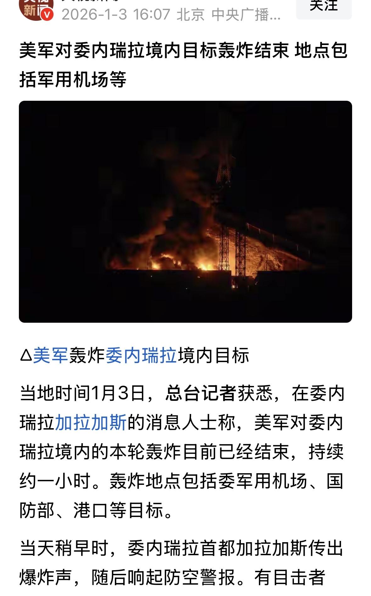一直以为委内瑞拉是个军事强国,美军才轰炸了一个小时,就结束了,难道委内瑞拉的防空导弹,战斗机没加油?还是没点火?一个也没有发射出去?一个美军飞机也没打?没放一枪吗!前几天,听专家们说,美国不敢对委内瑞拉动手,美军怕有来无回。#马杜罗# #委内瑞拉#
