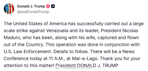 特朗普称已抓获委内瑞拉总统 美国称马杜罗在袭击中被捕2026年1月3日,美国总统唐纳德·特朗普表示,美军在夜间对委内瑞拉发动打击,已抓获委内瑞拉总统尼古拉斯·马杜罗及其妻子。此次行动引发了加拉加斯及其他州的爆炸,委内瑞拉随后宣布进入国家紧急状态,地区国家也相继表示谴责。热点现场海外新鲜事