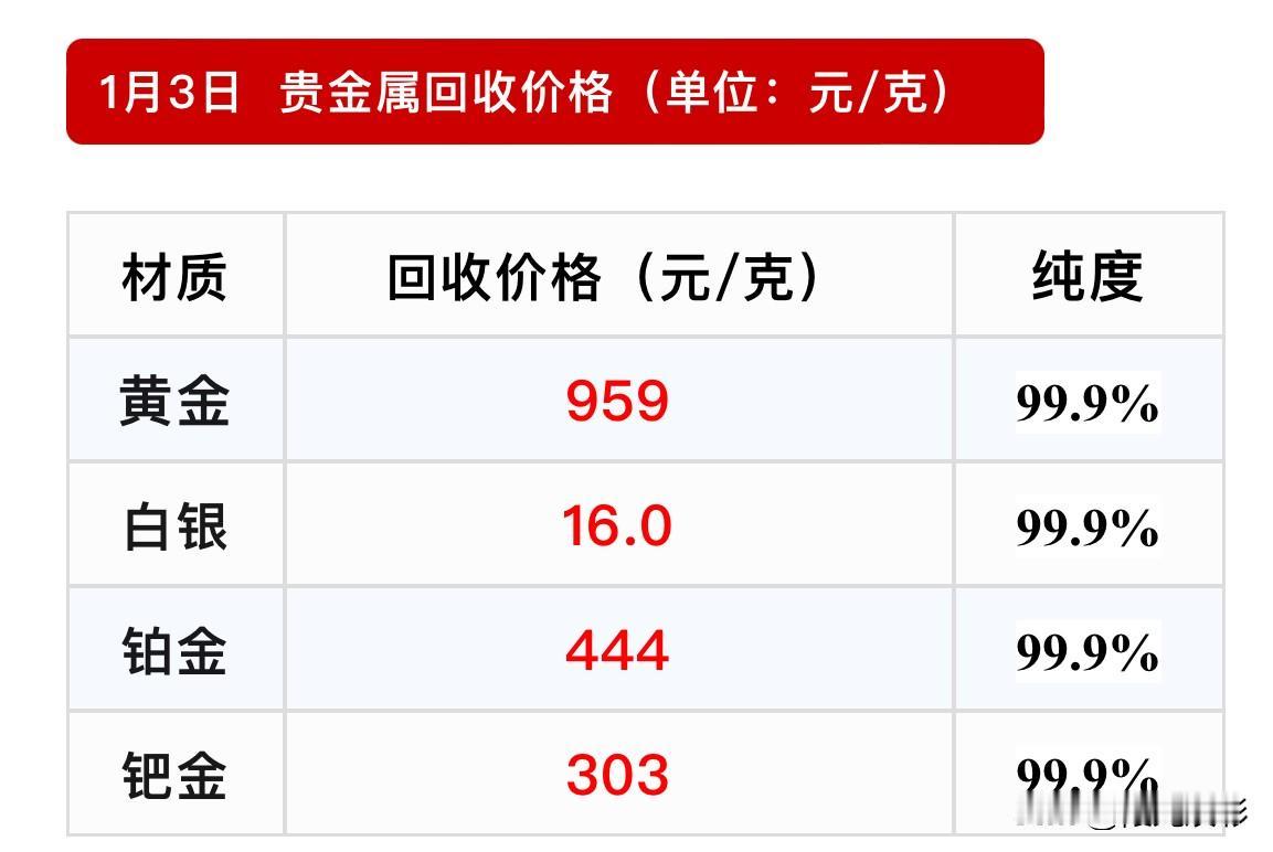 来看看! 黄金回收价格,这段时间走势分析! 黄金回收价格959元/克, 白银回收价格16.0元/克, 铂金回收价格444元/克, 钯金回收价格303元/克。 自黄金一路暴涨之后,黄金回收价格也一路上涨了,但是,最近黄金回收价格同去年相比较有所回落了。 从去年12月29日回收价格996元/克,一路下滑到今年1月1日黄金回收价格955元/克,再次,反跳到今天黄金回收价格在959元/克。 黄金回收注意事项: 1、了解黄金的重量,不清楚克重的朋友可以先找个地方(金店)称一下; 2、了解黄金的成色,一般黄金首饰上面标为足金999、AU999、AU9999等,成色都是没有问题的。不过需要注意有的黄金首饰款式的配件部分纯度会低一些(比如黄金耳钉的钉部分),这部分黄金回收价格会低一些。 3、了解当日的黄金行情,一般报价高于黄金行情的,说明有套路在等着你。 注:黄金价格是实时变化的,以上回收金价仅供参考,具体以结算价格为准! 理财有风险,入市需谨慎,不要盲目跟风! 金价回收行情 黄金白银价格 黄金价 黄金一克720 黄金回收价攀升 铂金回收行情 黄金回收价