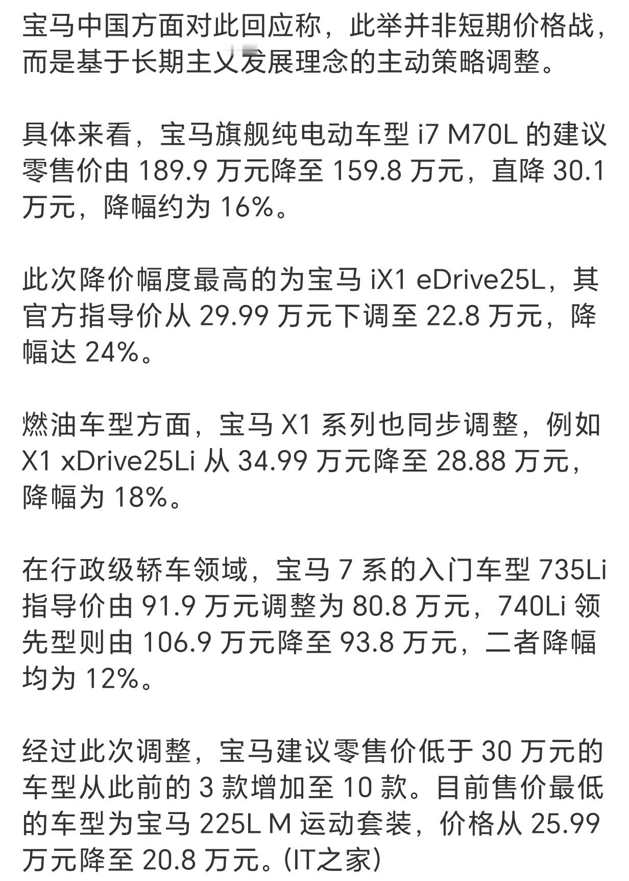 宝马中国回应最高降价30万说真的,降价我一点都不意外!现在国产电车都卷成啥样了,智驾、座舱、续航性价比直接拉满,花一半的钱就能享受到越级的体验。如果豪华车再不放下身段,真的要被比下去了