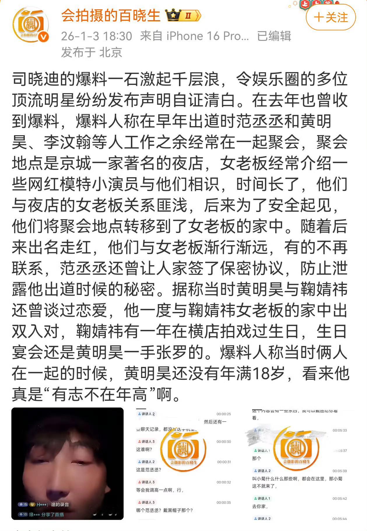 曝黄明昊鞠婧祎谈过司晓迪自曝Justin大好人放心睡,狗仔爆料黄明昊未成年和鞠