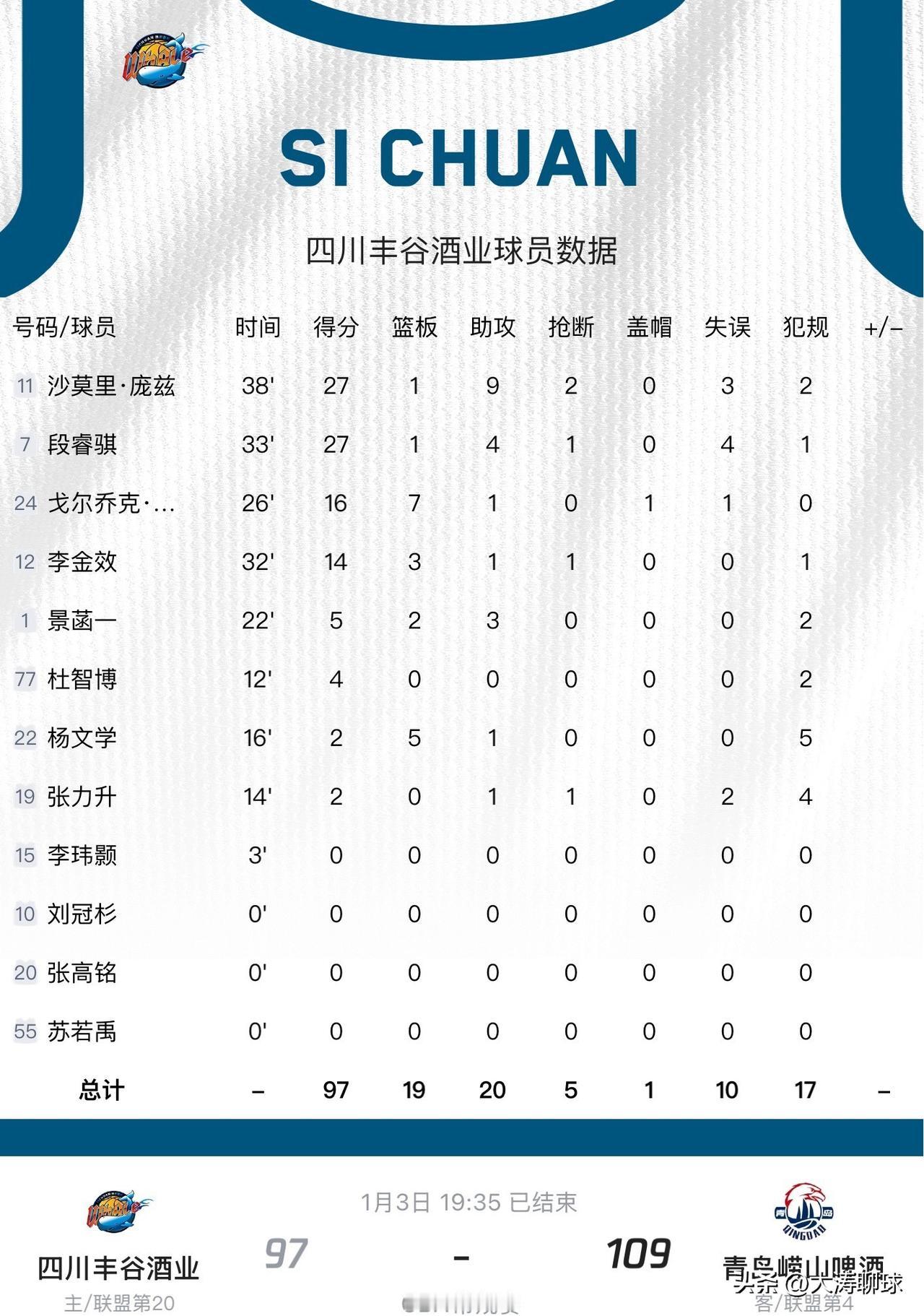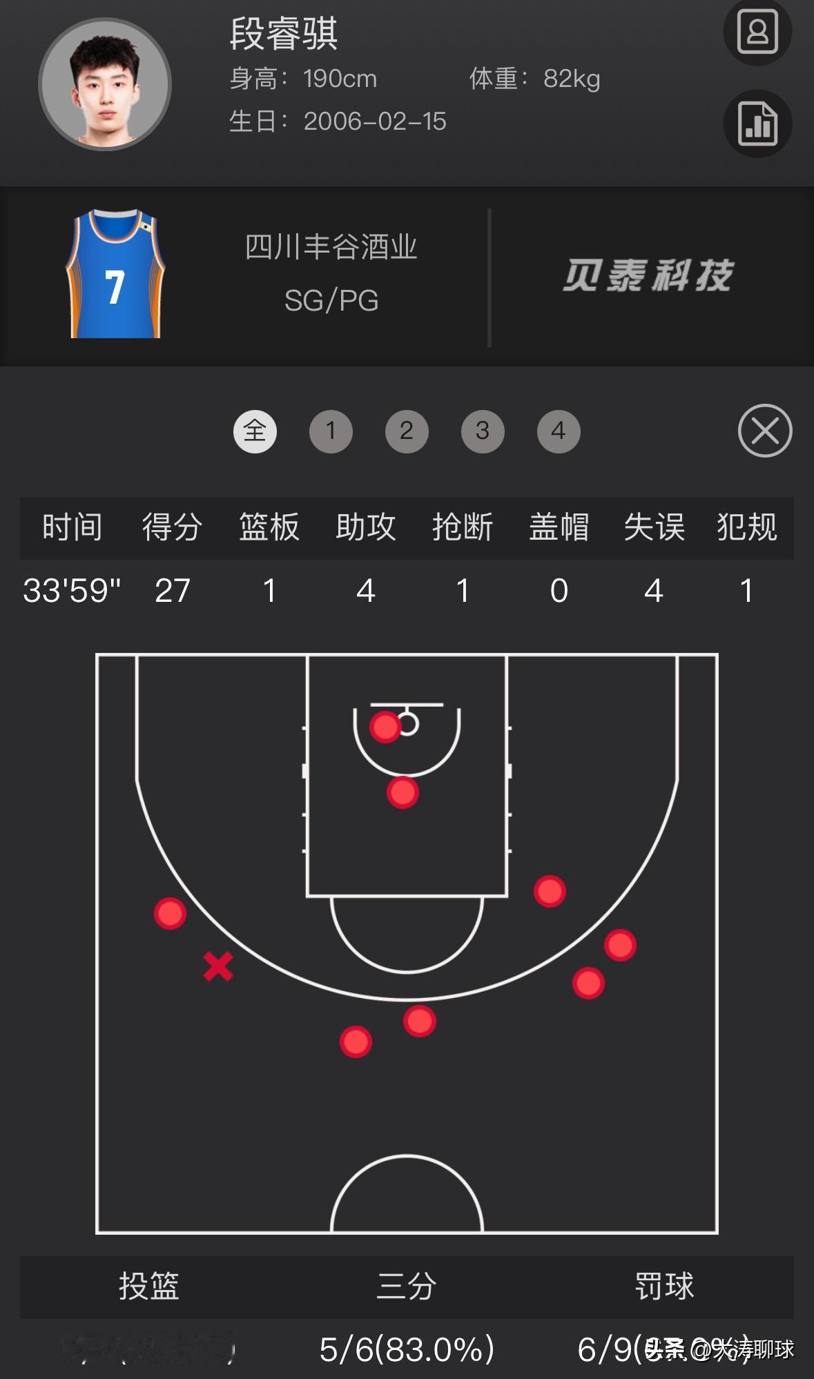 杀疯了!可惜段睿骐空砍27分4助攻,在刚刚结束青岛崂山客场109:97大胜四川丰谷酒业!段睿骐出场33分钟,投篮9中8,三分球6中5,全场砍下27分,外援庞兹16中10,拿下27分9助攻但其他队员发挥一般;青岛韦瑟斯庞拿下29分14助攻3抢断3篮板,米奇22分9篮板,王睿泽25分4篮板3助攻!
