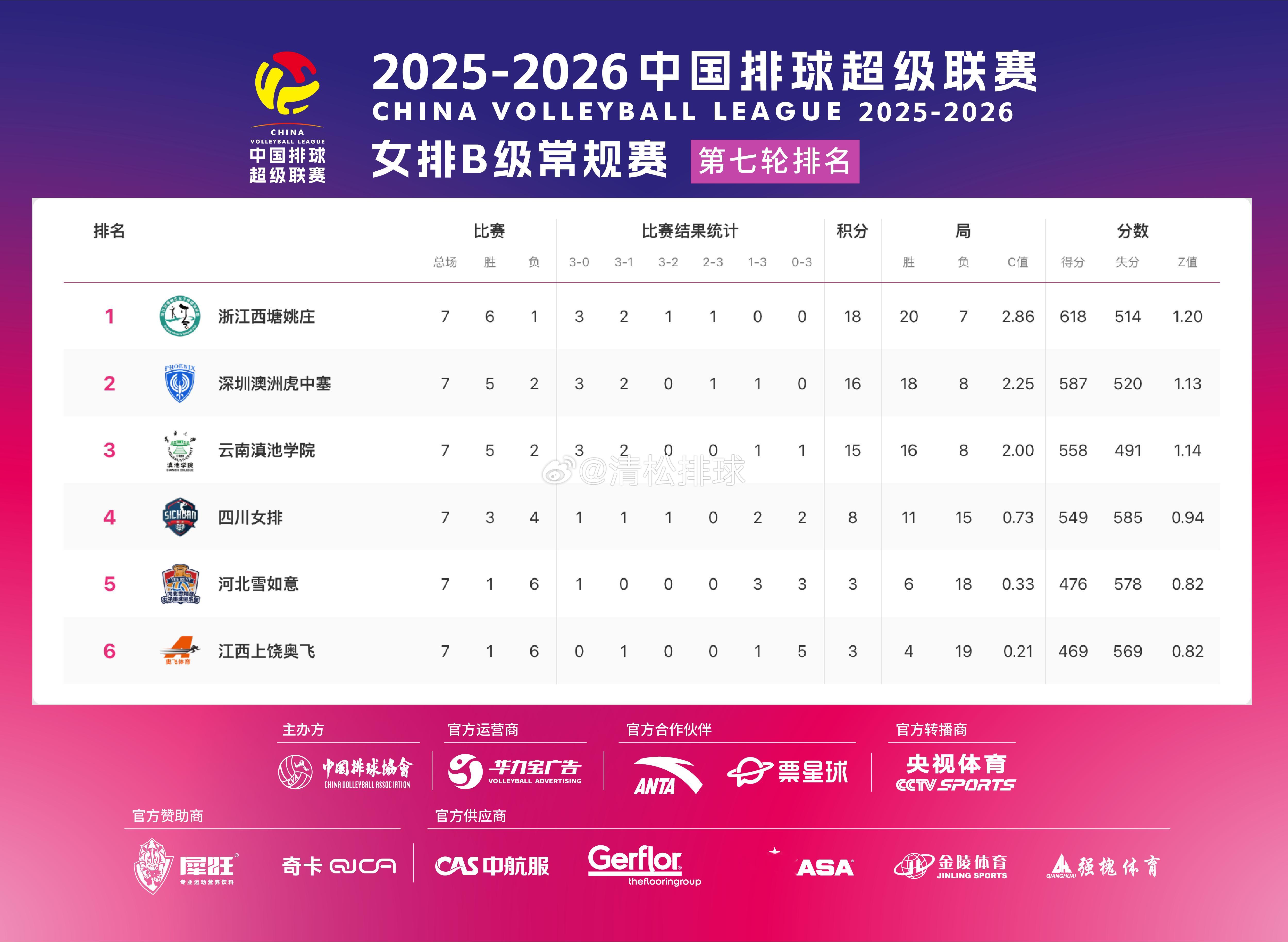 【积分榜】2025-2026中国女排超级联赛常规赛B级第七轮后积分榜浙江西塘姚庄:18分(6胜1负)广东深圳澳洲虎中塞:16分(5胜2负)云南滇池学院:15分(5胜2负)四川:8分(3胜4负)河北雪如意:3分(1胜6负)江西上饶奥飞:3分(1胜6负)清松带你看排球2025-2026中国女排超级联赛