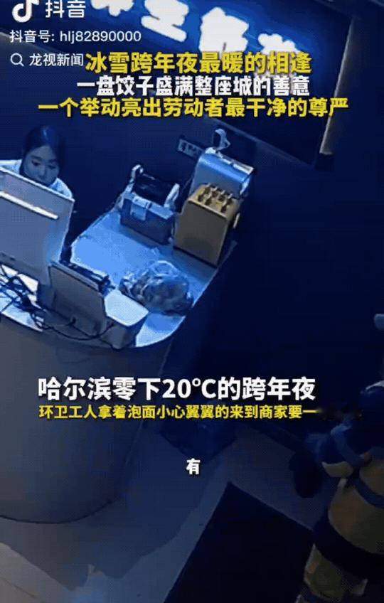 太暖心了!黑龙江哈尔滨,跨年夜的晚上,环卫大爷去店铺要开水泡面,店员热情给大爷烧水泡面。大爷吃面时,老板娘竟然端出一盘热腾腾的饺子给大爷。 跨年夜的晚上,环卫大爷还坚守在岗位上,天气很冷,又到了吃饭时间。大爷走进一家店铺,客气地问店员,能不能给他点开水,他把方便面泡上。店员热情地招呼大爷进屋,让他坐到沙发上休息。随后店员就去给大爷烧开水了,水烧开了,店员帮大爷把面泡上。还让大爷就在店里吃。 正在大爷吃泡面的时候,老板娘端来一盘热腾腾的饺子,给大爷加菜。大爷感到非常不好意思,来这要开水,还吃人家一盘饺子。大爷吃完饭后,细心地擦干净桌面和地面。离开的时候,特意和店员说感谢,还鞠了一躬。 走到店铺门口,大爷拿起扫把,还把店铺门口扫干净了。 这真是双向奔赴的善意!店员和老板娘热情地对待环卫大爷,大爷也非常感谢她们的帮助。善良遇上善良。虽然冰城哈尔滨的天气非常寒冷,但是这份善意让大家心里格外温暖。 这世间最动人的,从来都不是什么惊天动地的大事。就是这样你递一份暖,我还一份真的双向奔赴,才最戳人心窝。
