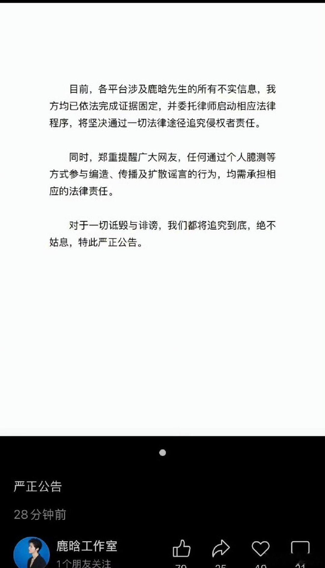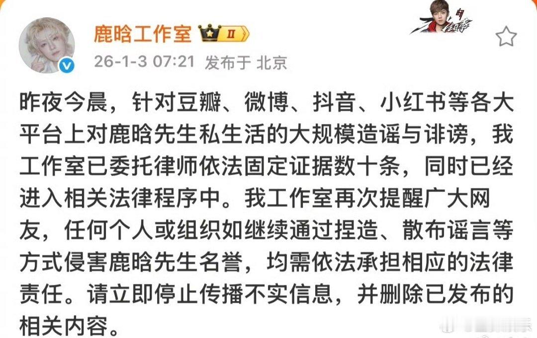 iamroosie 鹿晗 网络并非法外之地,请停止造谣。吃瓜也得带脑子。那张所谓的“鹿晗床照”被网友扒出好多漏洞:耳洞数量不对,发色和时间线对不上,衣服细节也有问题,被怀疑是AI合成的。爆料逻辑根本经不起推敲。支持鹿晗硬刚到底。工作室已经声明完成所有平台证据的区块链存证,公布了部分造谣账号。法律程序已经启动,就等一个结果。网络不是法外之地,造谣必须付出代价