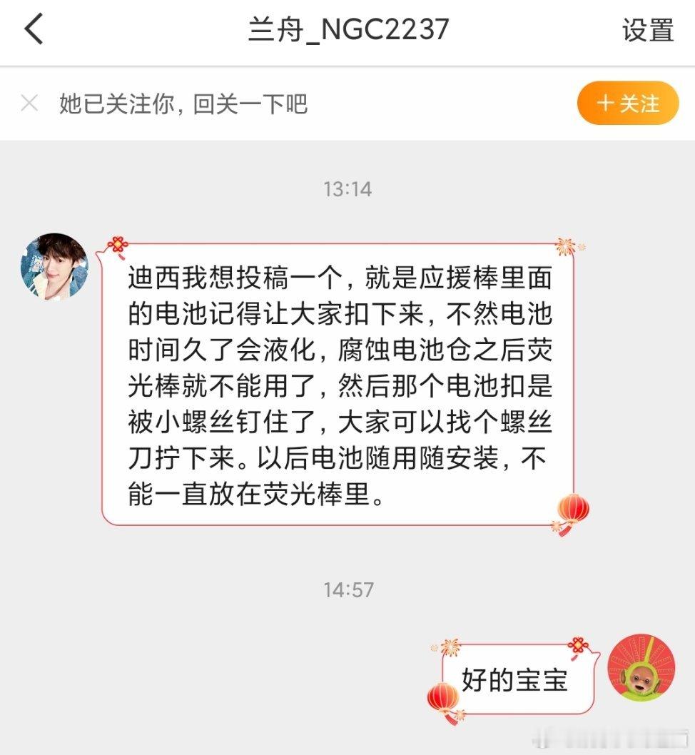 有yuni宝宝提醒大家:应援棒里面的电池记得让大家扣下来,不然电池时间久了会液化,腐蚀电池仓之后荧光棒就不能用了,然后那个电池扣是被小螺丝钉住了,大家可以找个螺丝刀拧下来。以后电池随用随安装,不能一直放在荧光棒里。