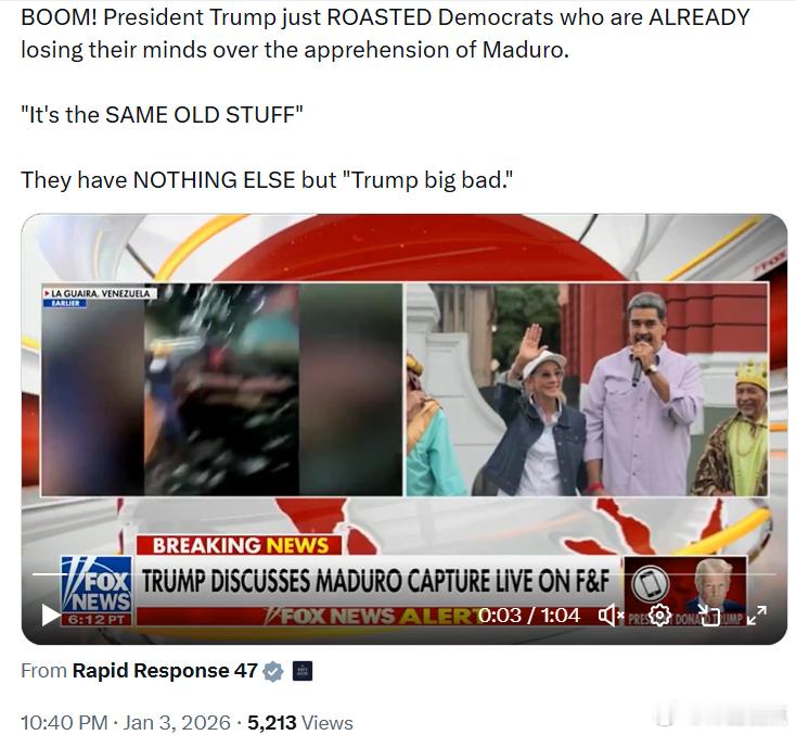 特朗普总统刚刚痛批那些因为马杜罗被抓而已经崩溃的民左党人。“这还是老一套。”他们除了‘特朗普是大坏蛋’之外,什么都没有了。