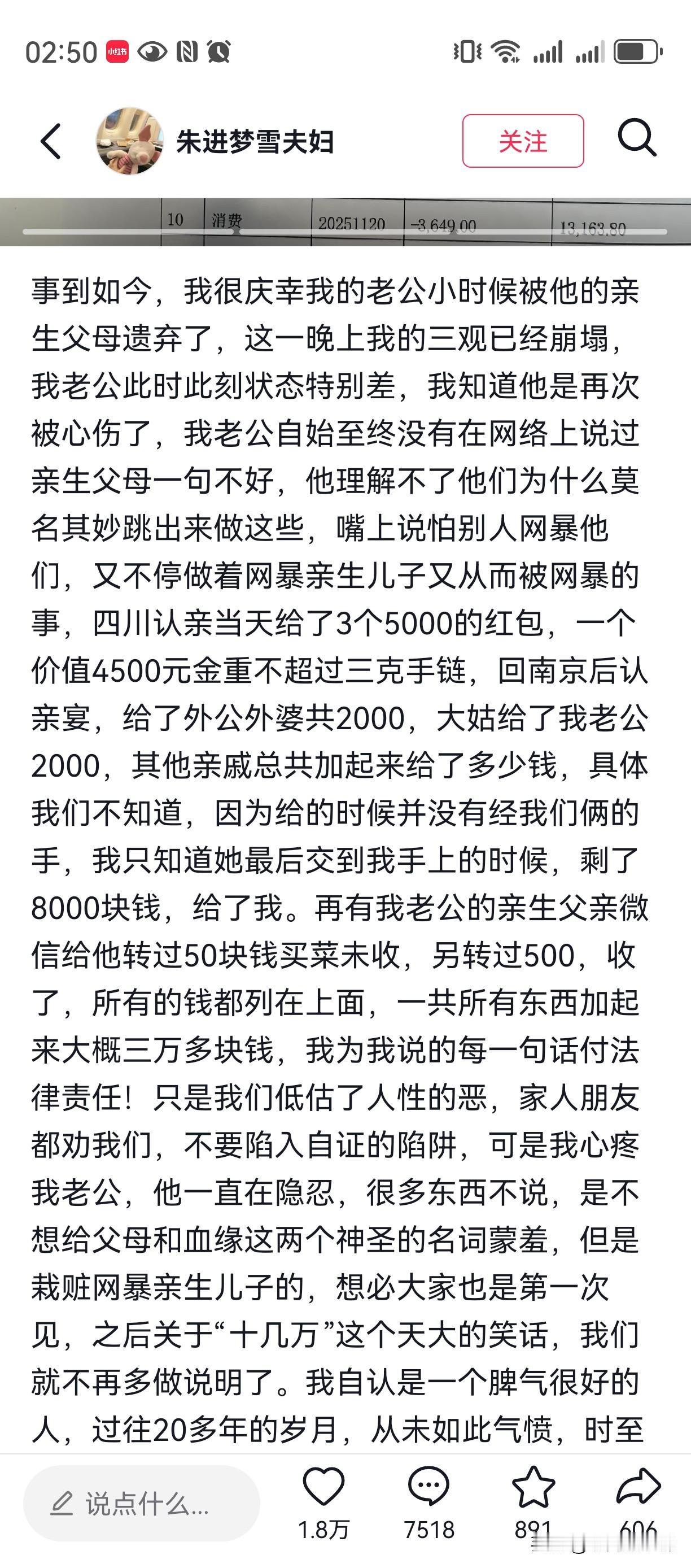 朱进心死了,名字改成“朱进要争气”了。真没想到认亲还能遇到碰瓷的!认亲前亲生父母说会给一套房和多少现金。前几天的直播中,亲妈说认亲的时候给了朱进十万,还有黄金,还有亲戚们给的红包。 没想到竟是弥天大谎,朱进虽气愤,但只是自己隐忍,最后妻子看不过,在自己账号晒出亲生父母所给。所谓黄金,不过是一个只有3克重,价值4500块钱的手链,这个手链还是8月份没认亲的时候买给弟弟的。而其他钱前前后后加起来也不过2.8万而已。 3个红包1.5万,手链4500,朱进给外公外婆2000,大姑给朱进2000,认亲宴亲戚给了8000,亲爹转过500,来来回回,刚好2.8万。朱进能晒出证据,亲爹妈却只凭一张嘴,说给了十万却拿不出任何证据,网友纷纷点赞,只相信证据。 朱进早已后悔认亲了吧,10天时间就撕碎他27年对亲情的所有期待,如今只剩心伤。