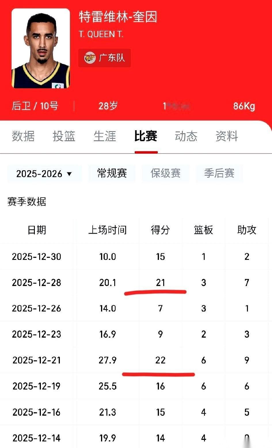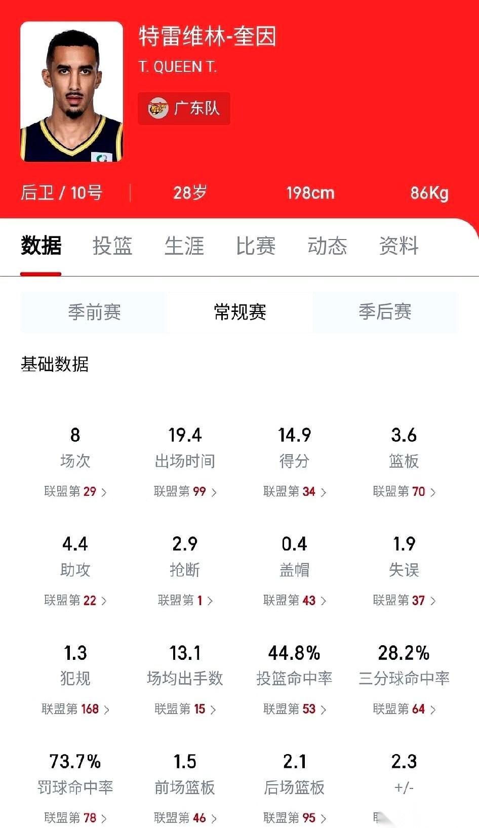 京粤大战还没开打,广东队那边先传来一个消息:防守大闸奎因,上不了了。 这一下,整个广东队的战术板,估计要被教练擦掉一半。 场均接近15分,这不是重点。重点是场均从对手手里硬生生掏走的近3次抢断,这条最凶悍的防线,直接断了。而且他专打硬仗,碰上青岛、山西这种强队,数据反而更猛。 他就是那个用一双长臂把对方头号得分手锁进柜子里的男人,现在这个柜子,门开了。整个防守体系被撕开一个大口子,冷风往里直灌。 所有的目光,一下全打在了张皓嘉身上。 这还没开球,天平好像就已经歪了。所以这场球,到底是核心缺阵后的单方面碾压,还是有人能在绝境里把剧本给改了?